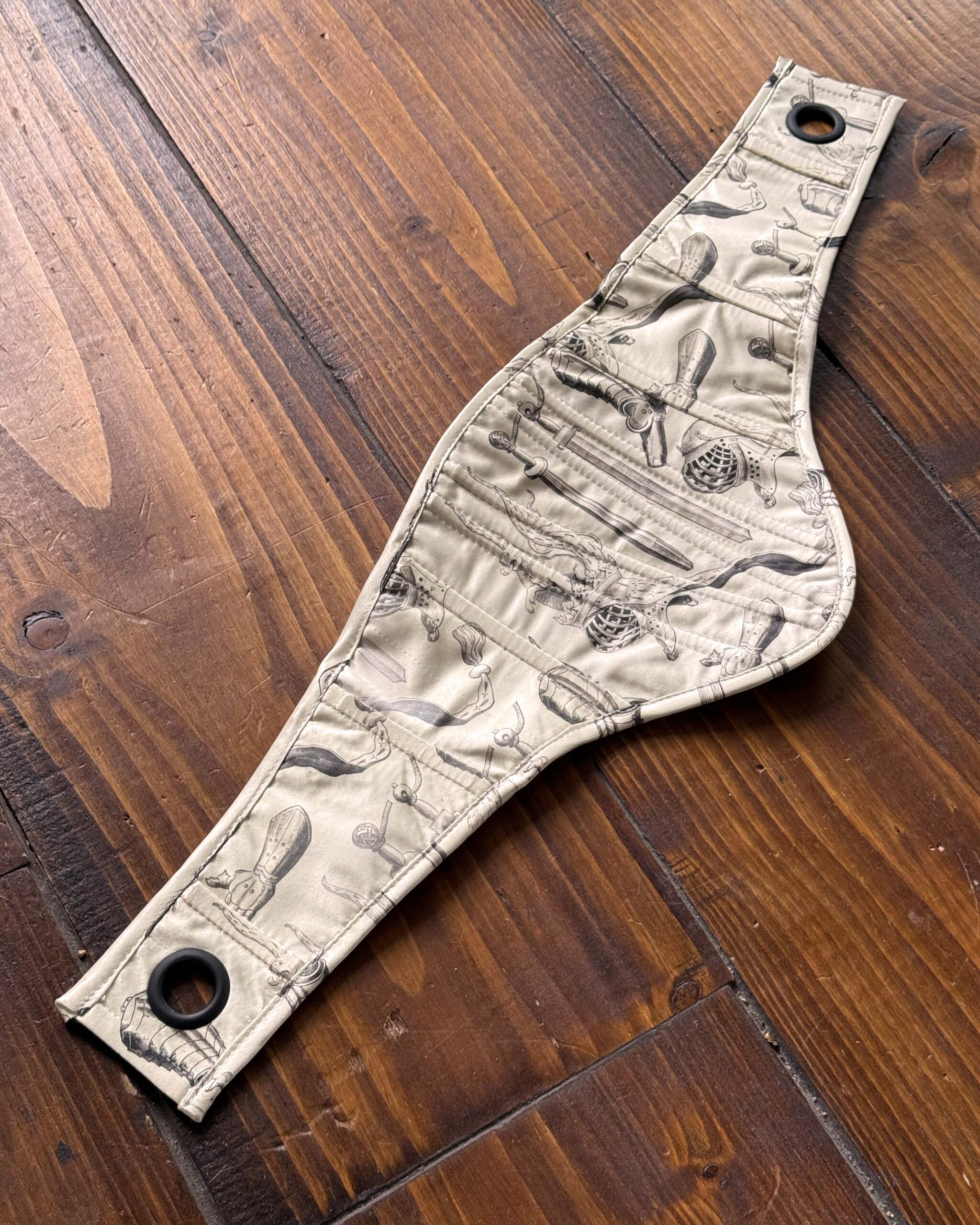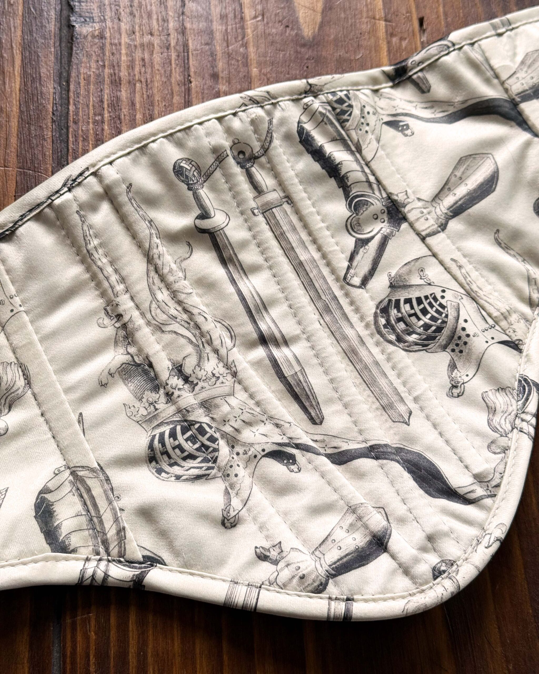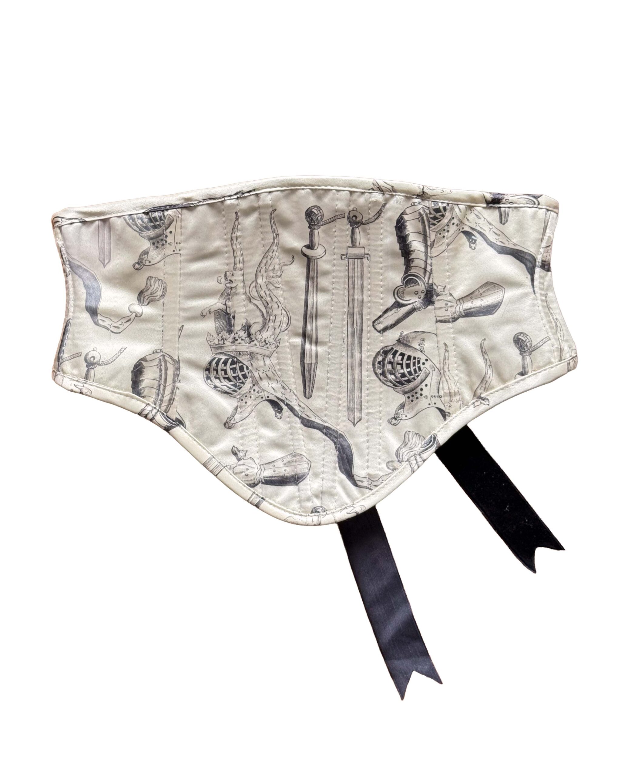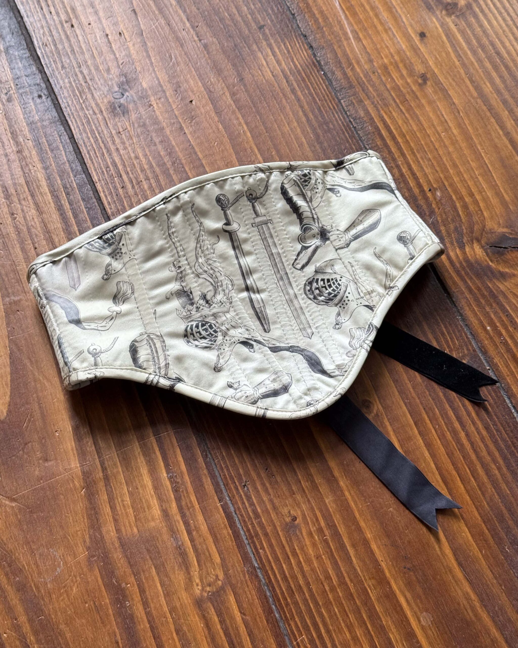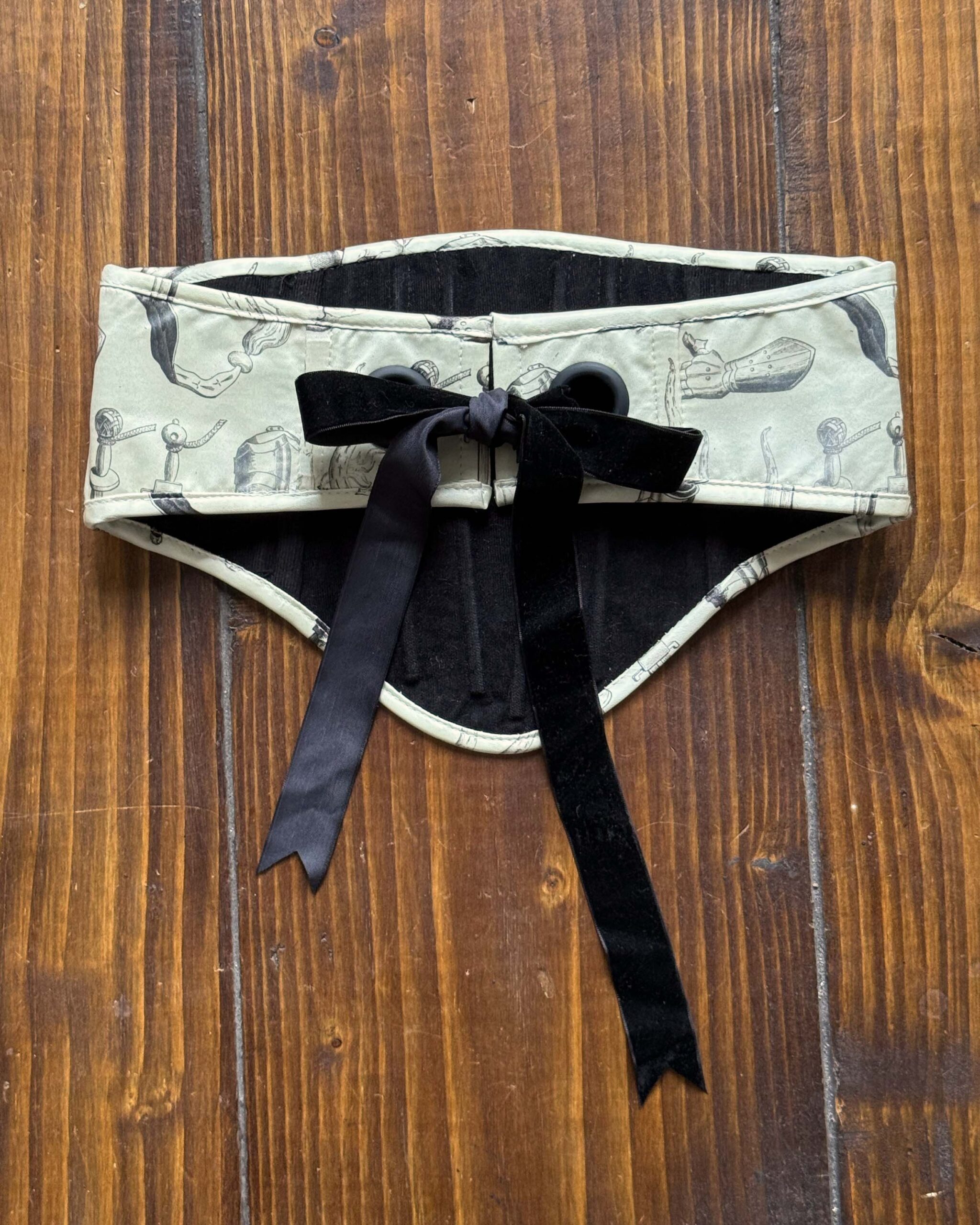 Printed deadstock twill corset belt lined in recycled polyester velvet, with a coutil underlayer and boning throughout for structure. Laced in black recycled velvet ribbon.