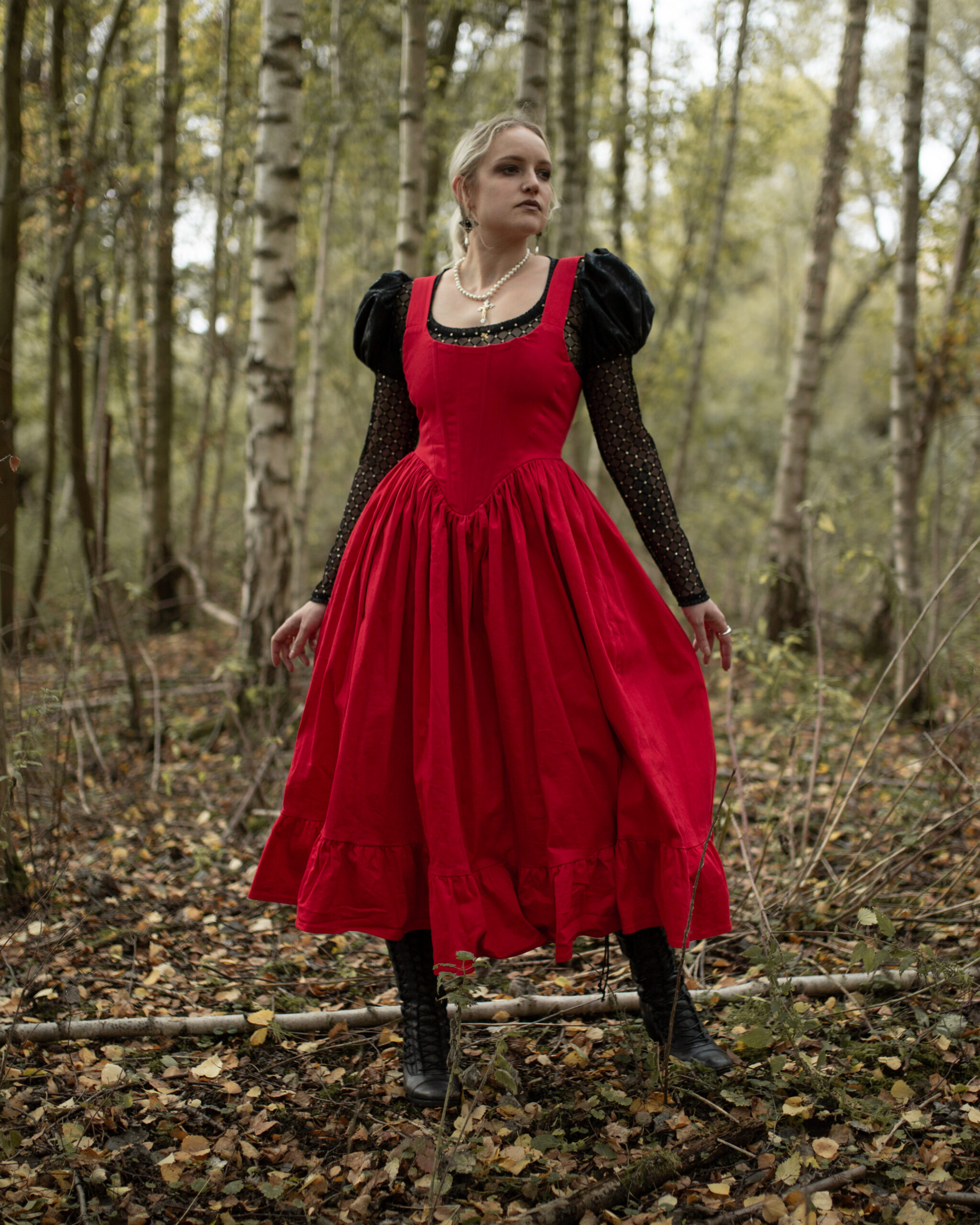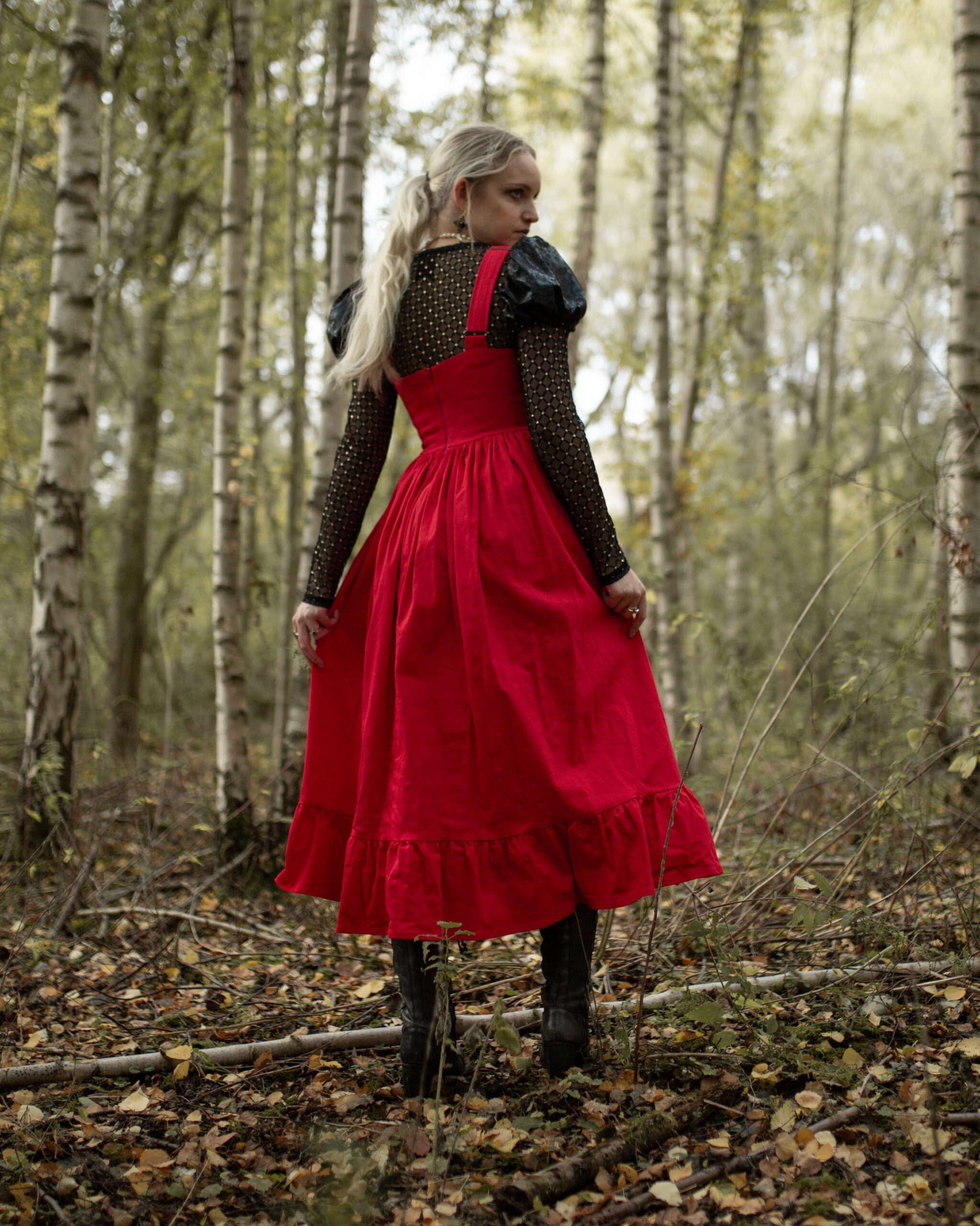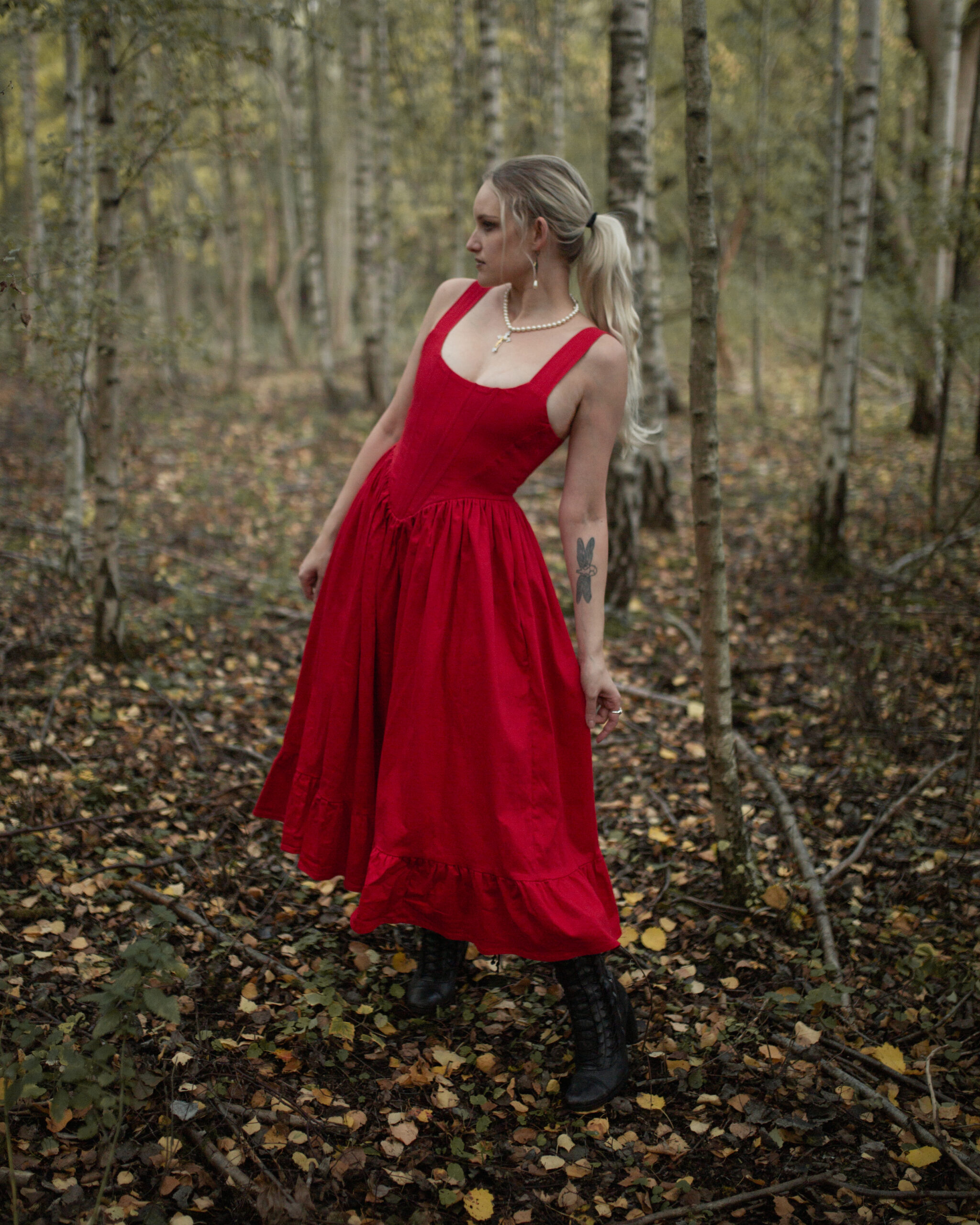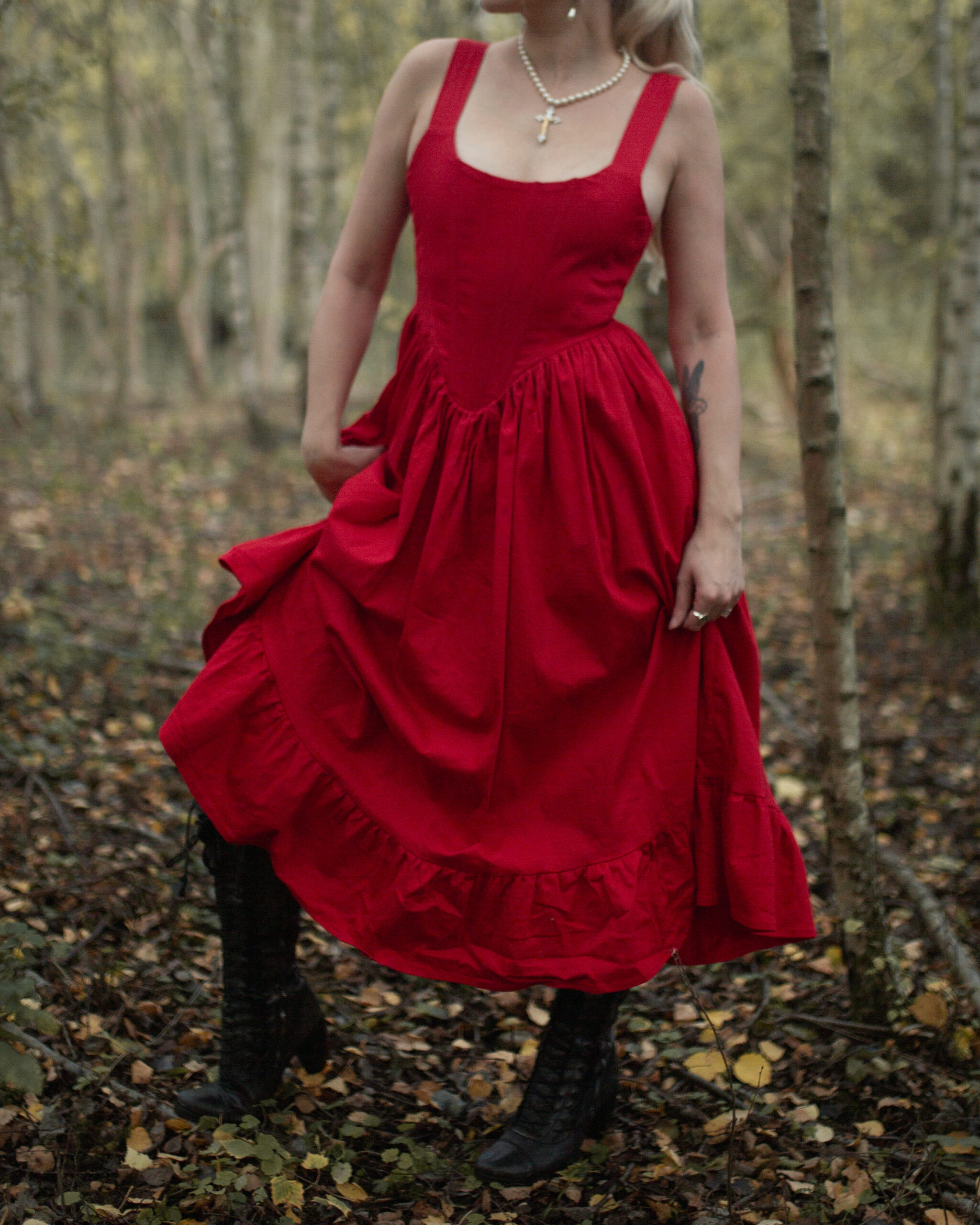 This red cotton twill dress is a period inspired dream with boning to the bodice and fully enclosed inner seams. It closes with a zip at the centre back, has adjustable straps and features hidden pockets at the hip.