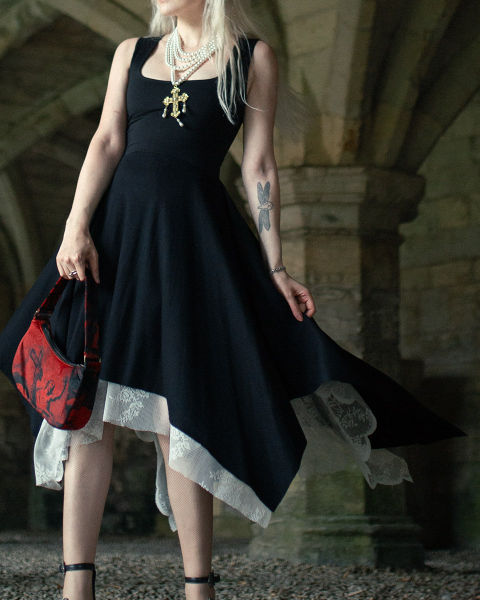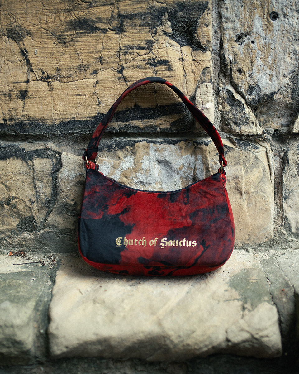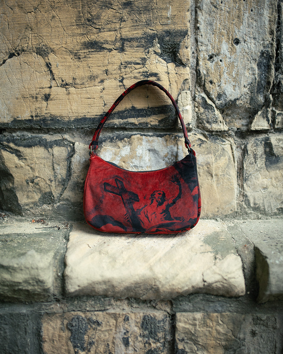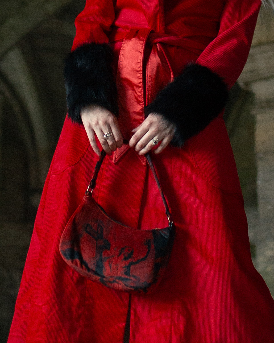 Recycled velvet print handbag with gilded detail, lined in deadstock satin and presented in a one of a kind dustbag. Each bag may differ slightly depending on the area of the print used, making each one unique.