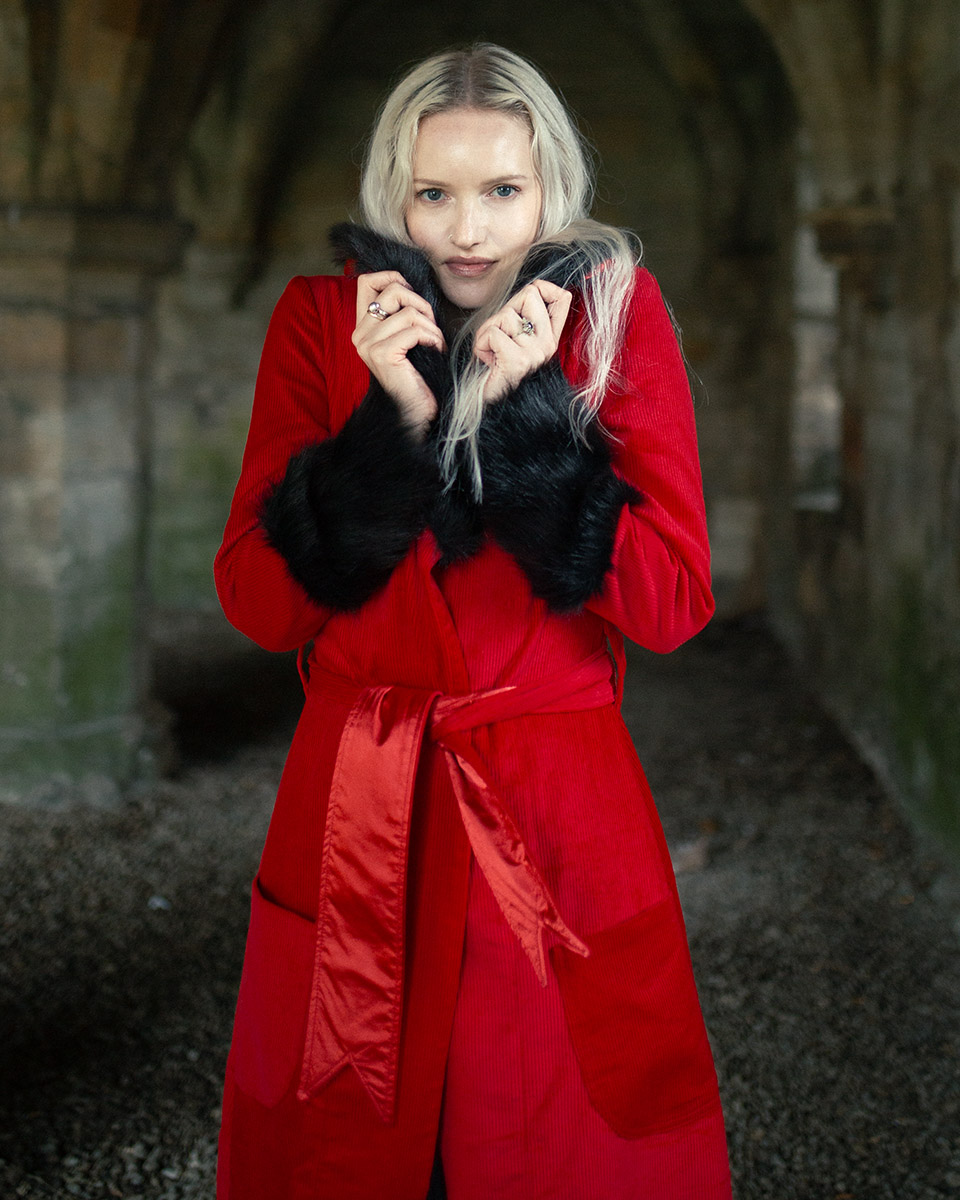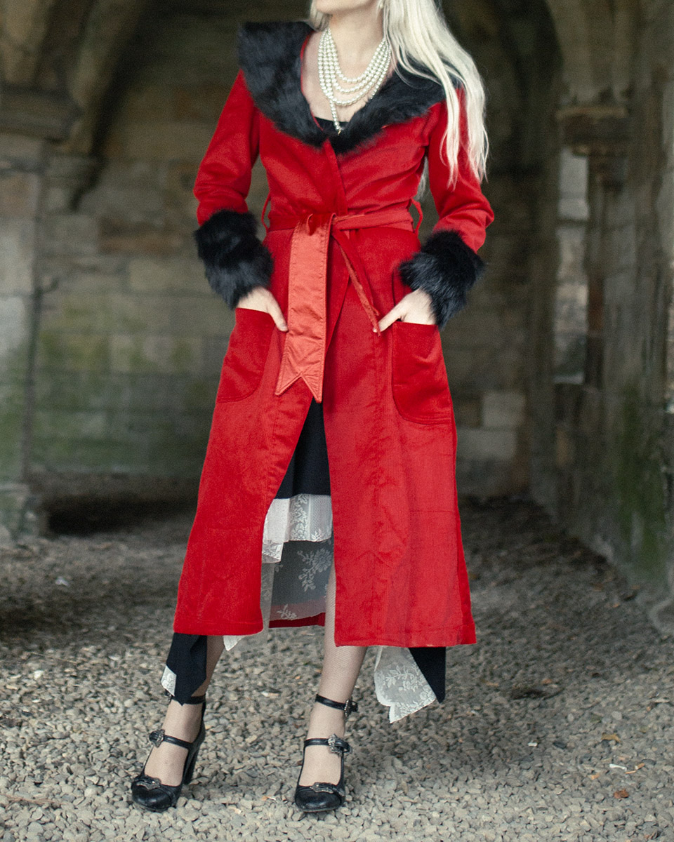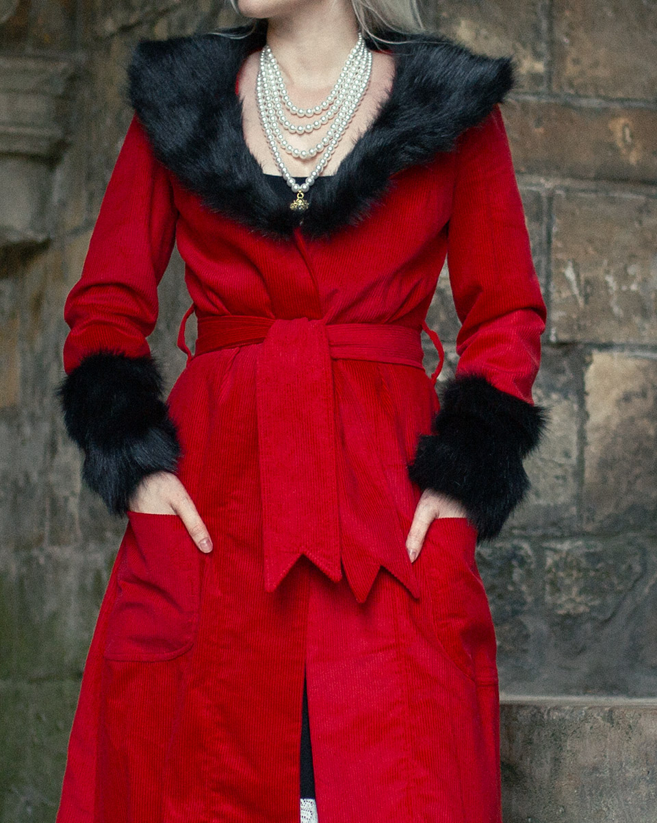 Cotton corduroy duster coat with faux fur trim, pockets at hip.