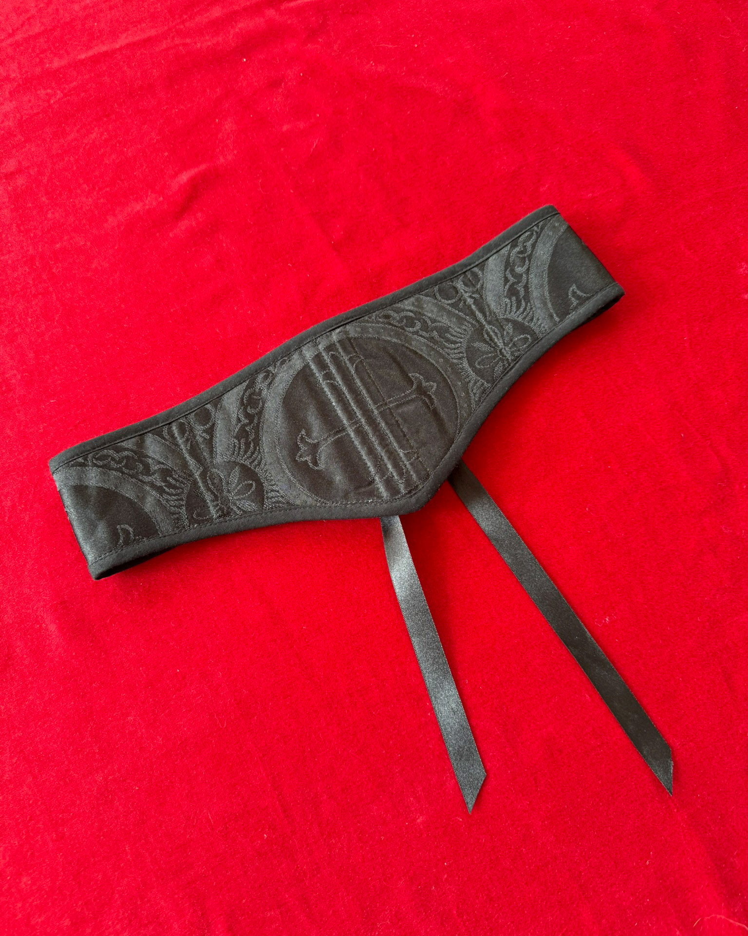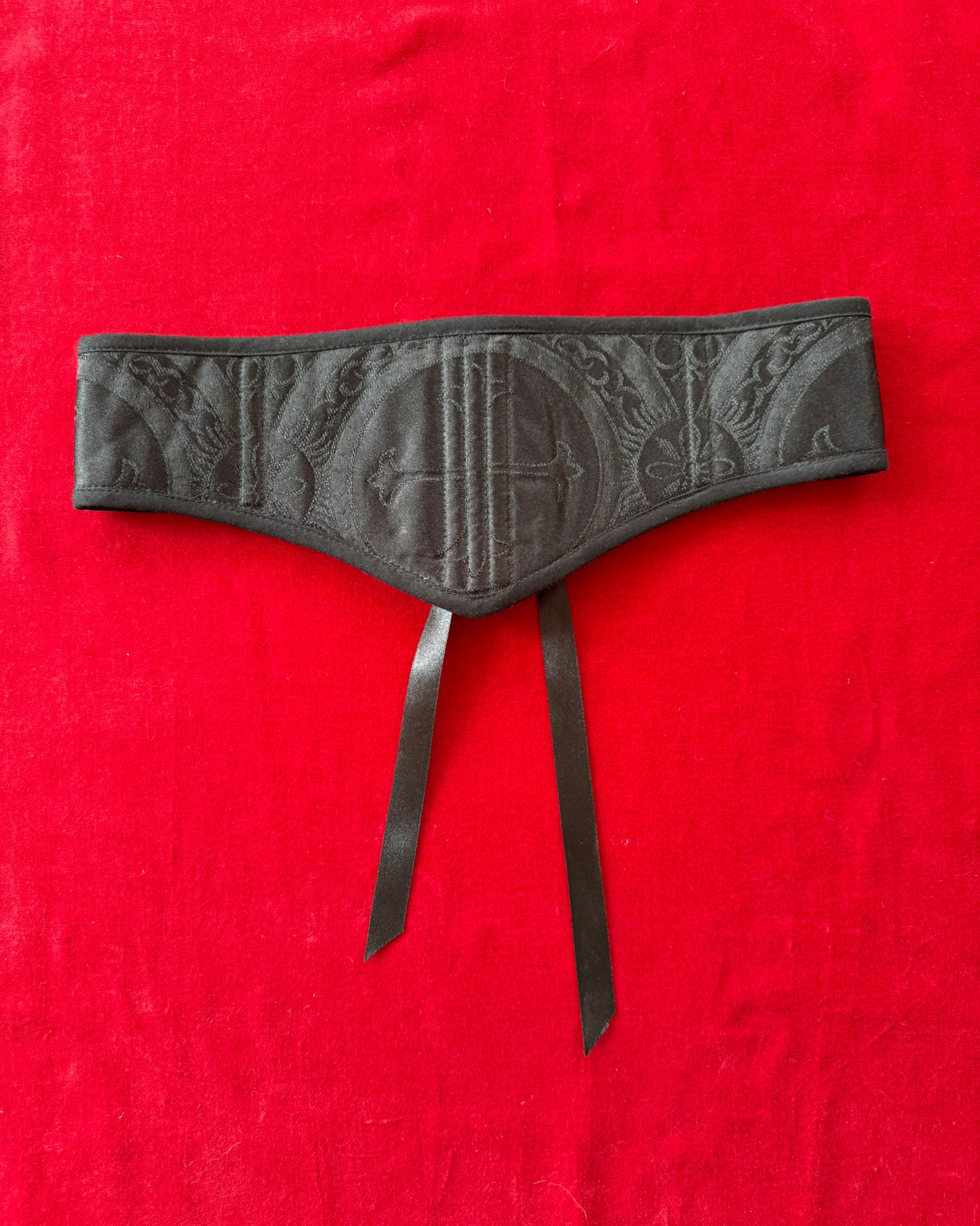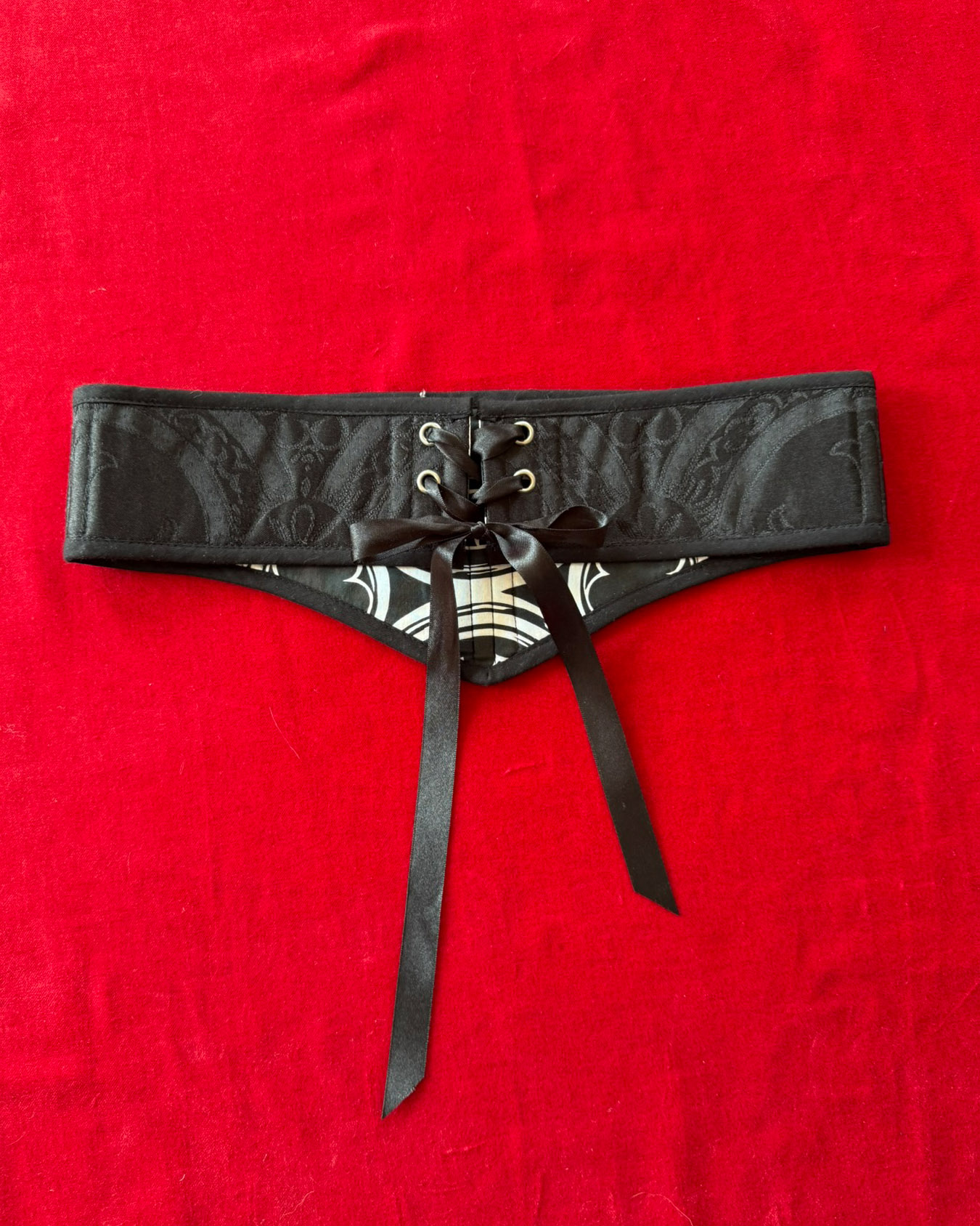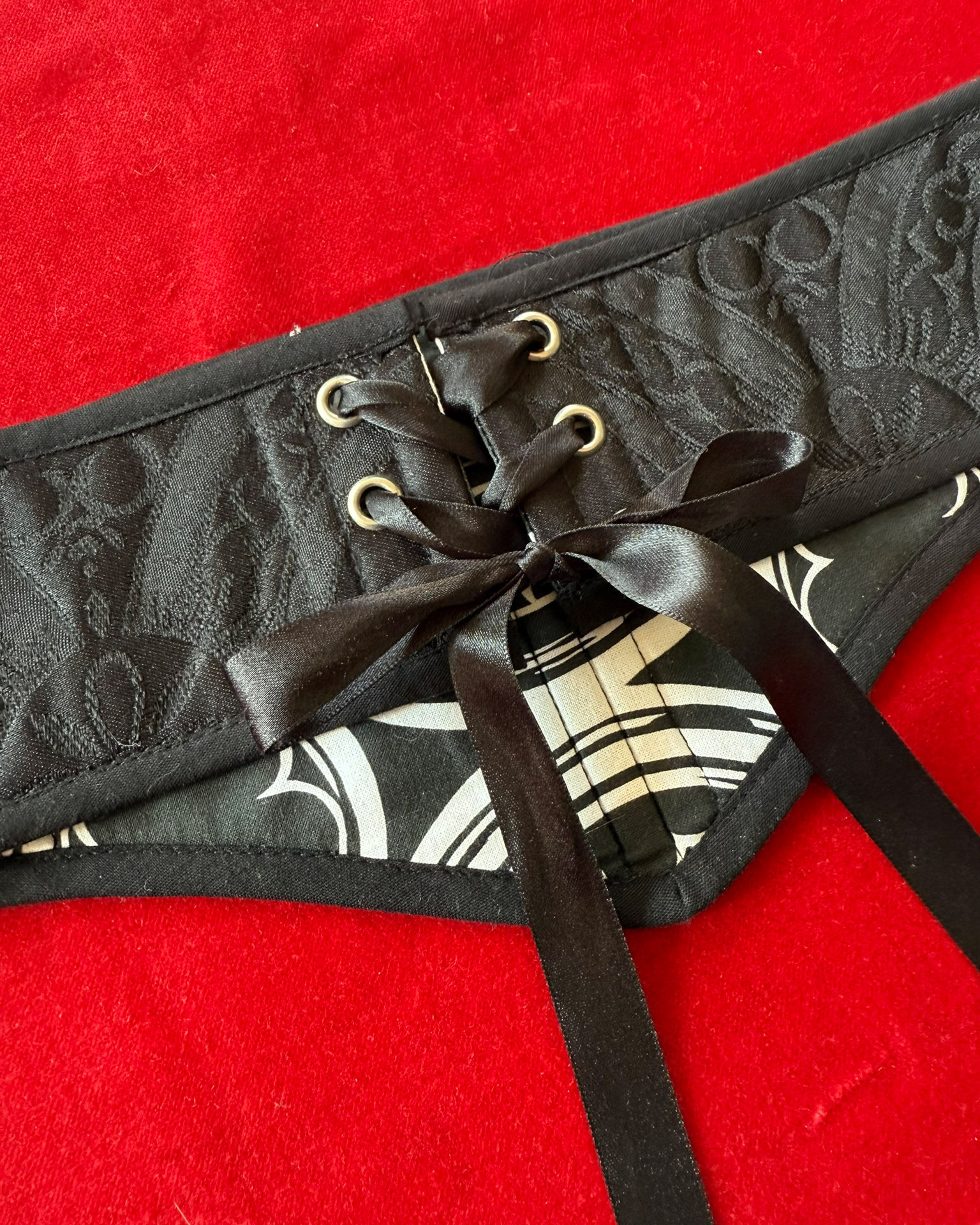 One of a kind corset laced in recycled ribbon in liturgical brocade, lined in printed cotton.