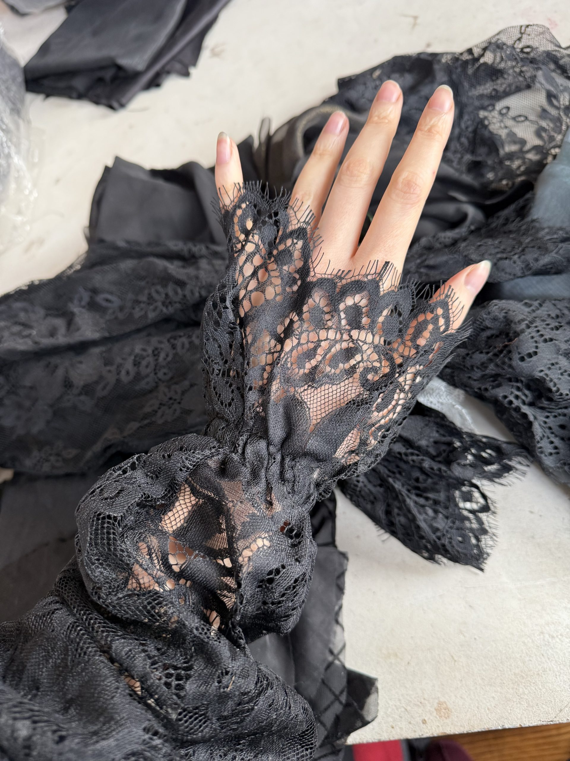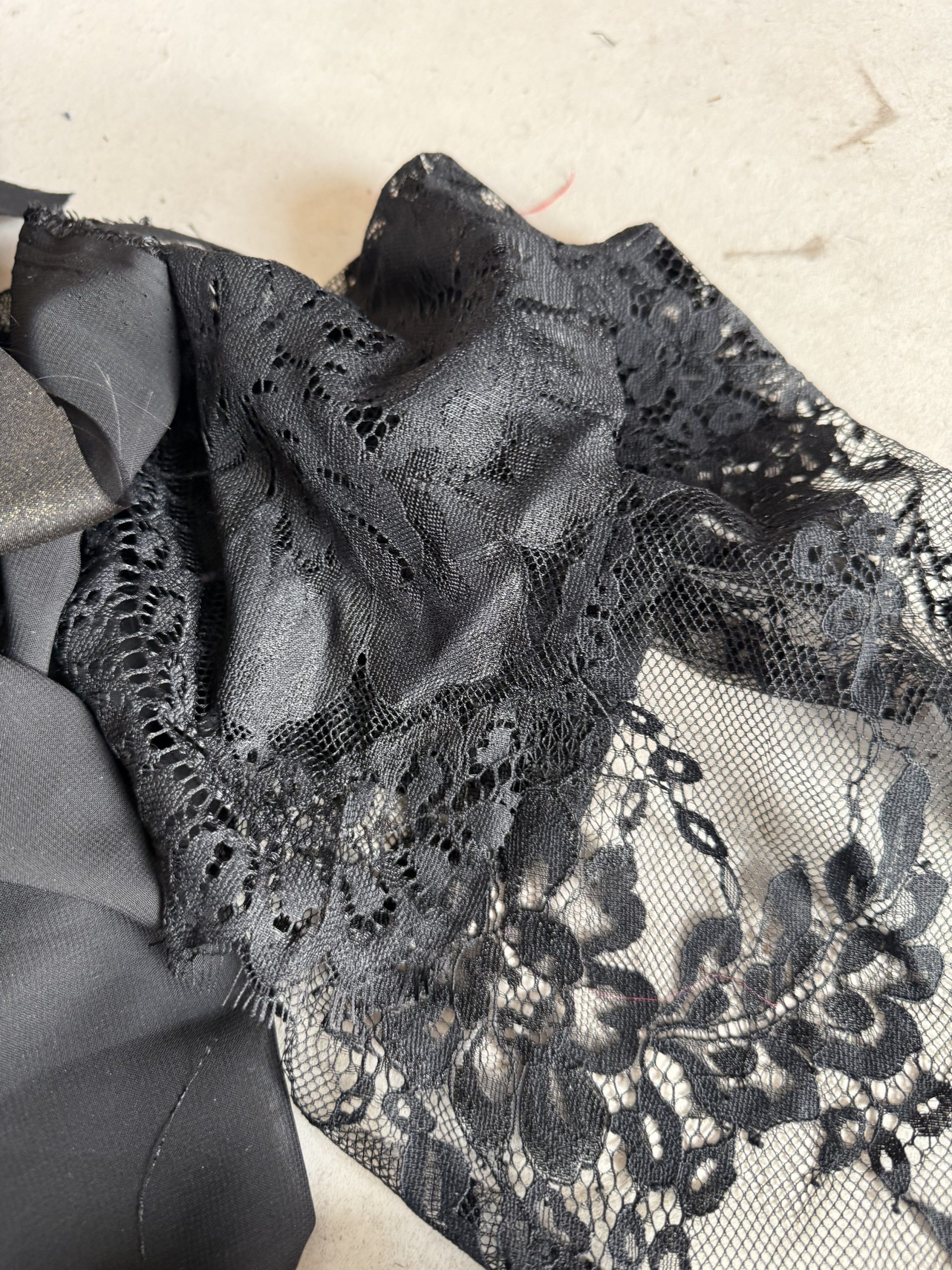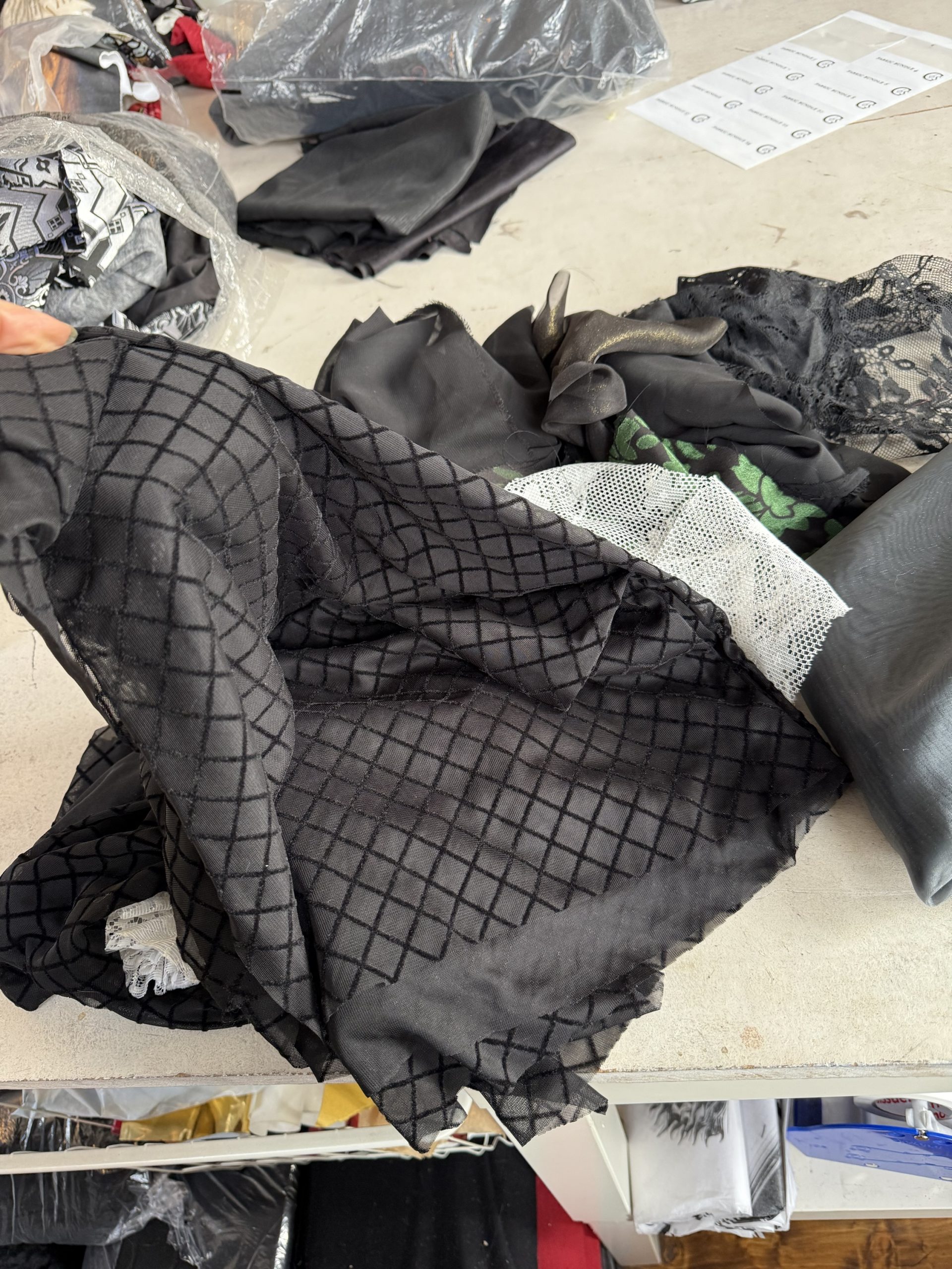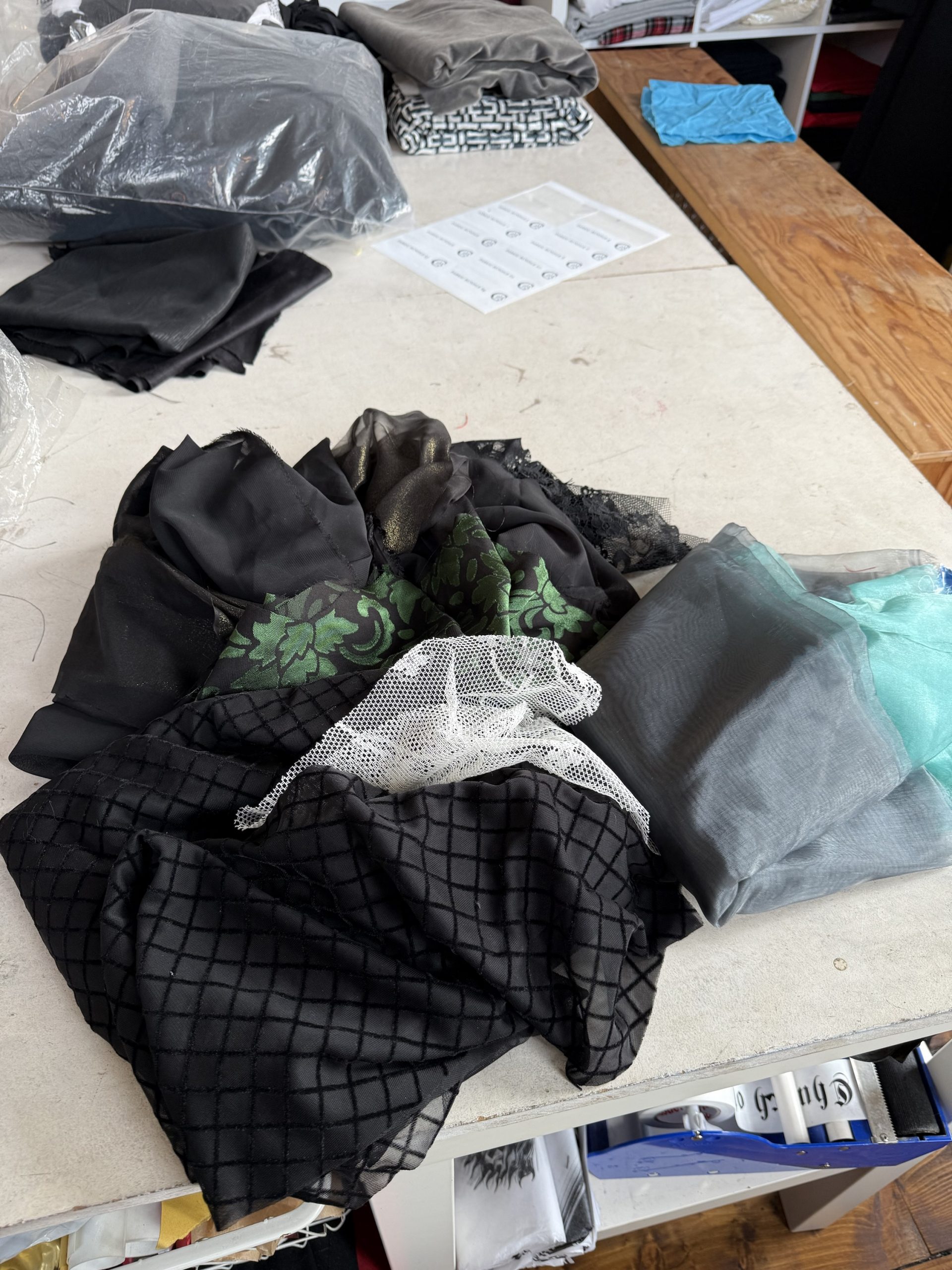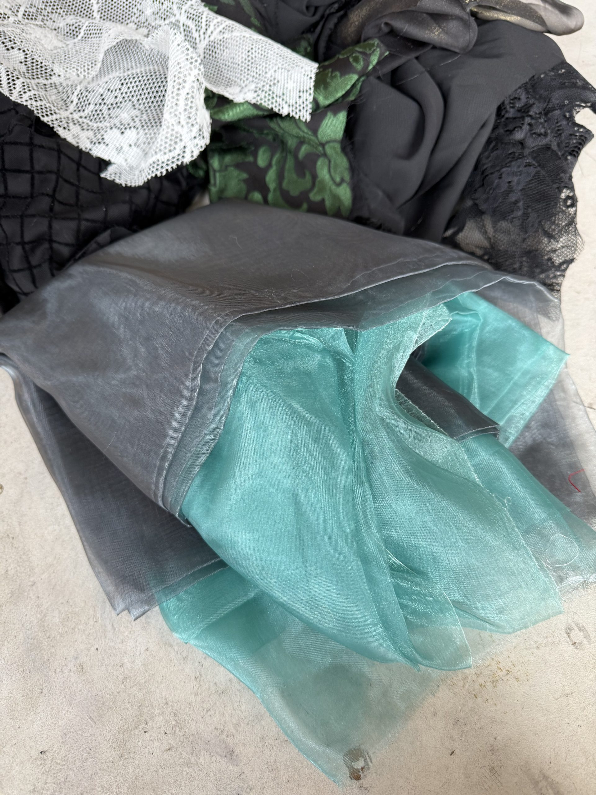 Lace, mesh, nets and chiffons. Includes a few full metres of organza and even some partially articulated lace sleeves that never got used.