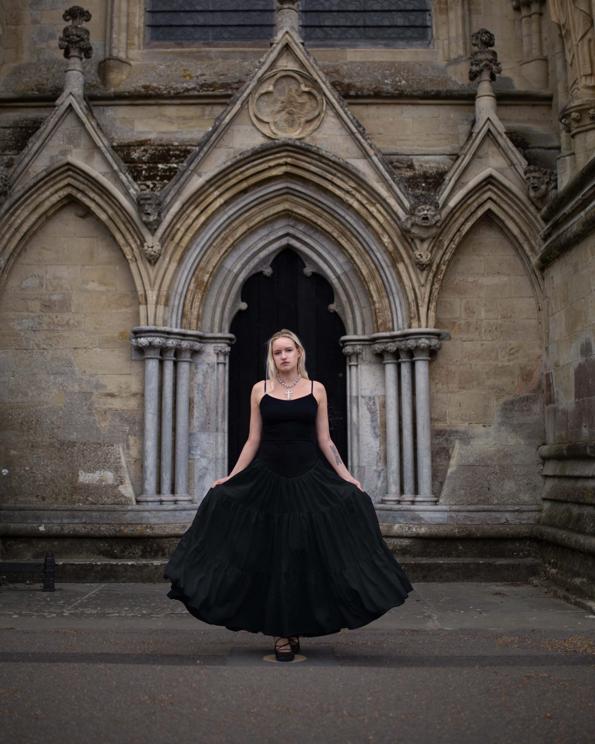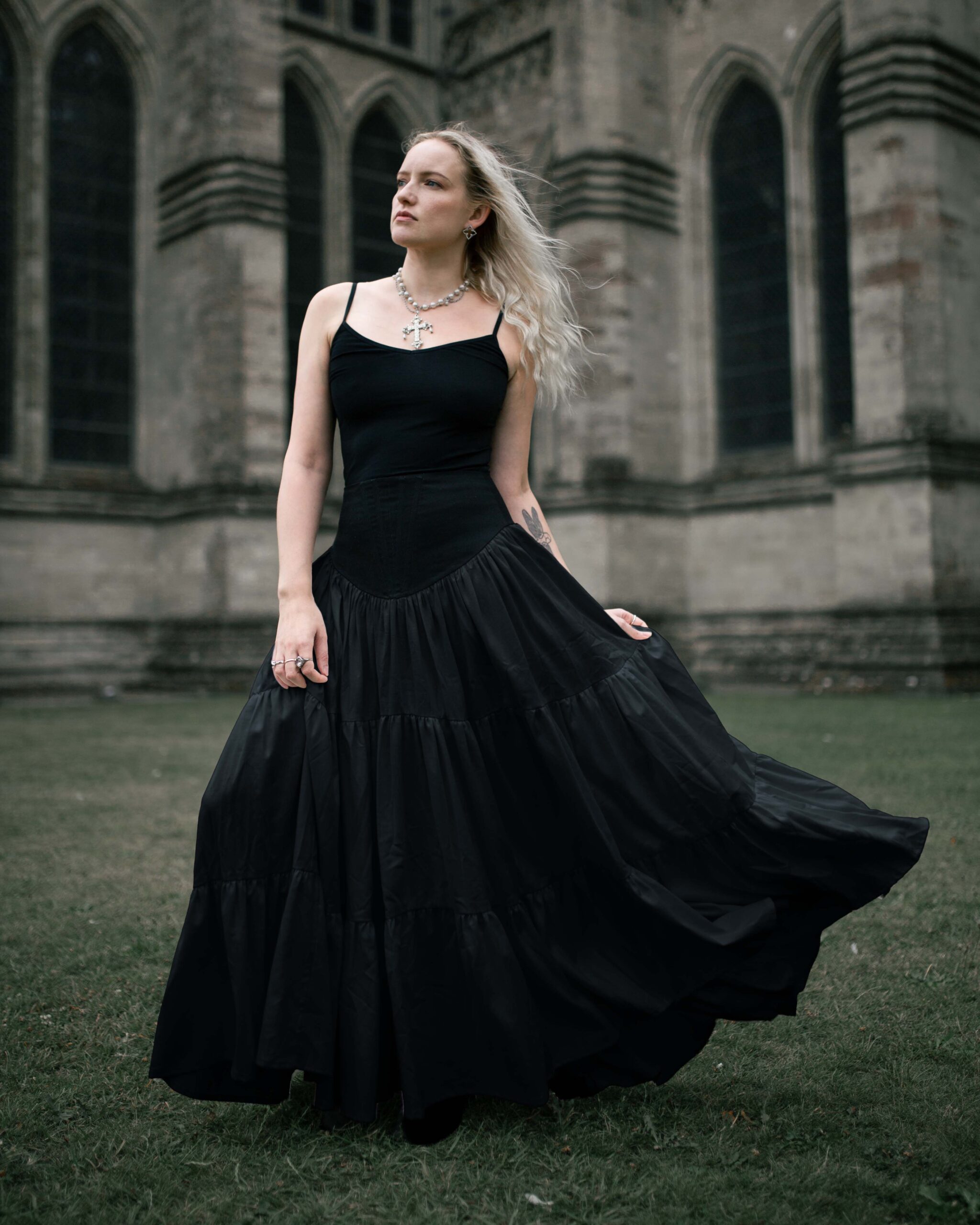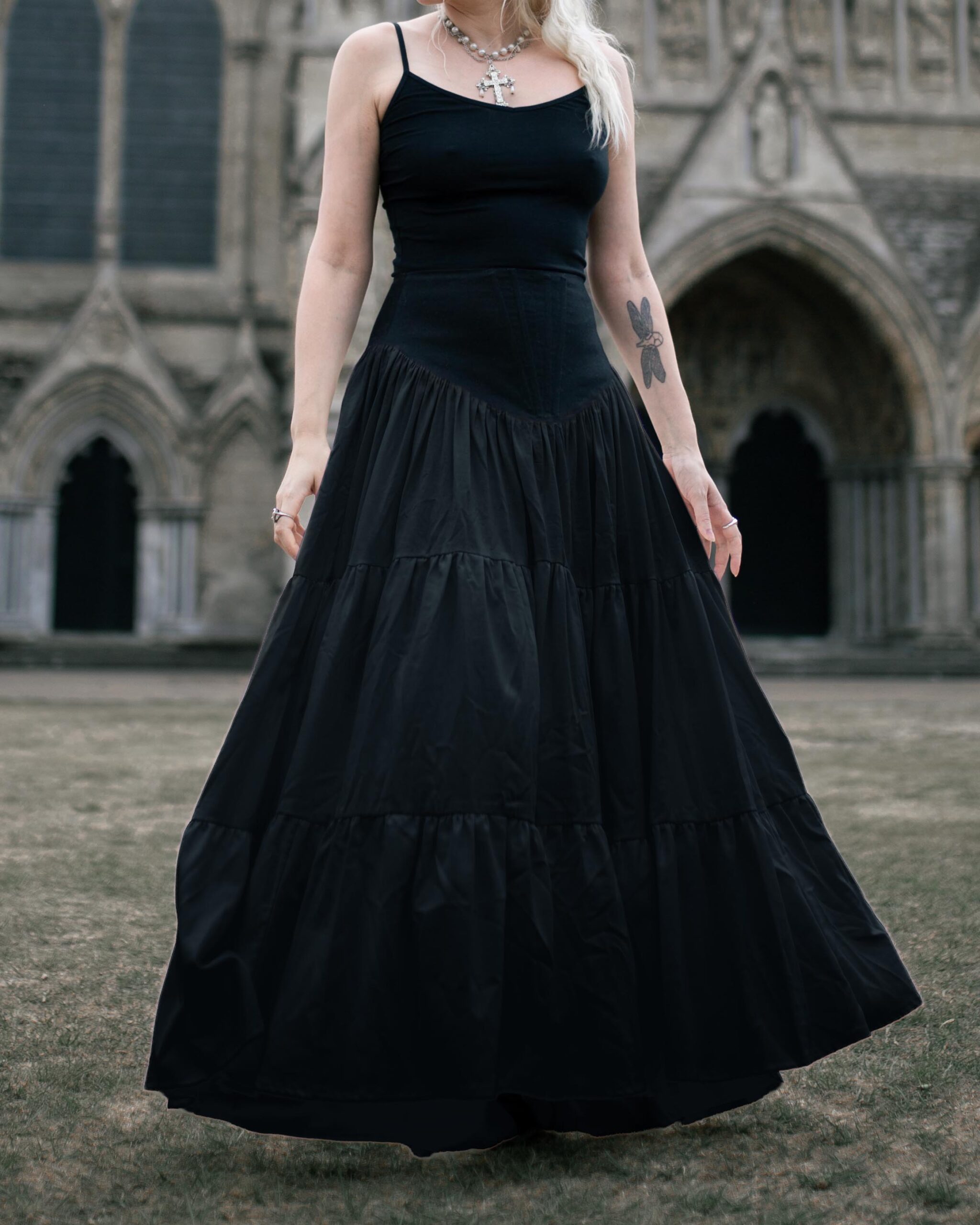 Cotton sateen & linen mix skirt with voluminous tiers reaching the floor. Featuring a corset style waistband with light boning to the centre front, and zipper closure in the centre back.