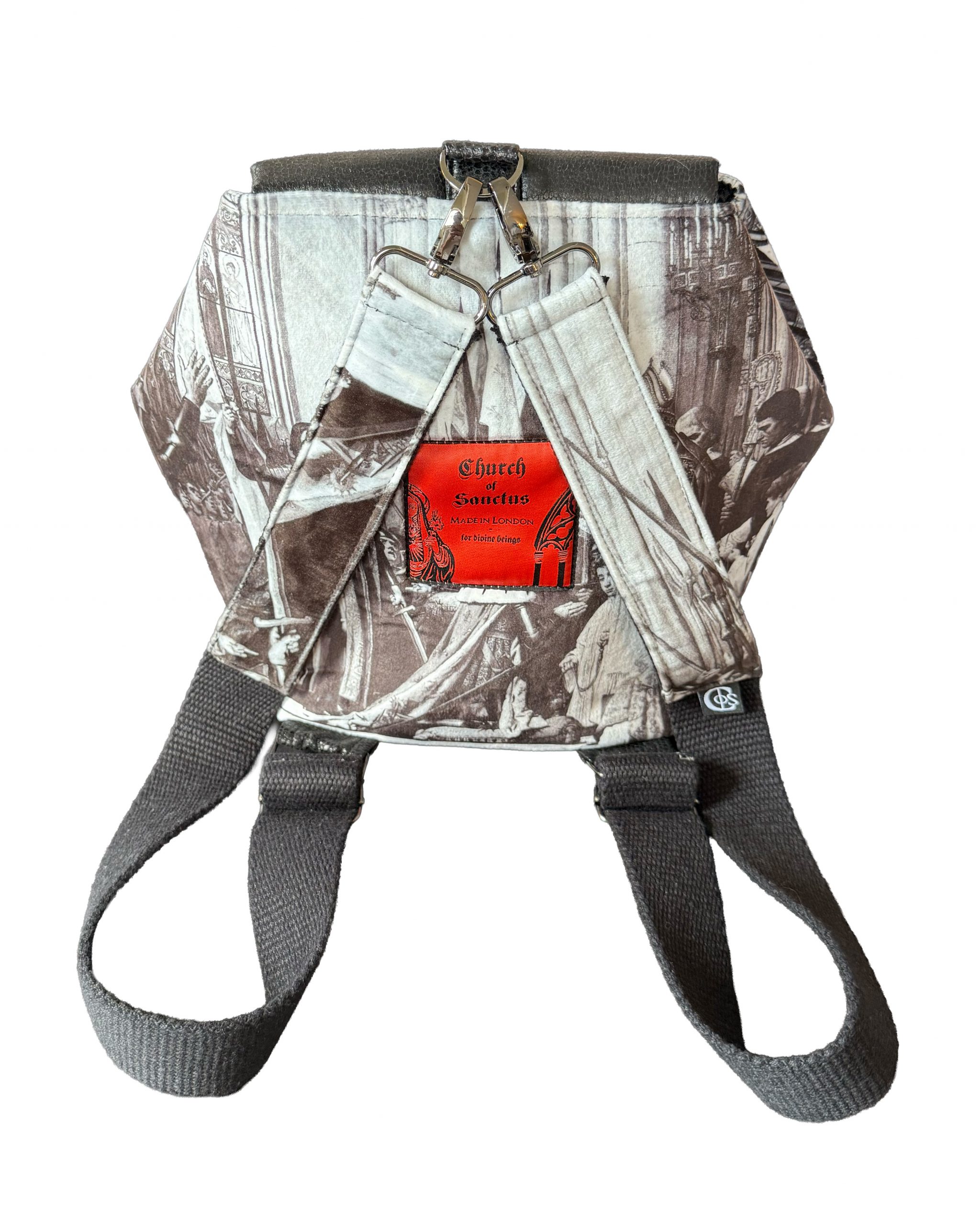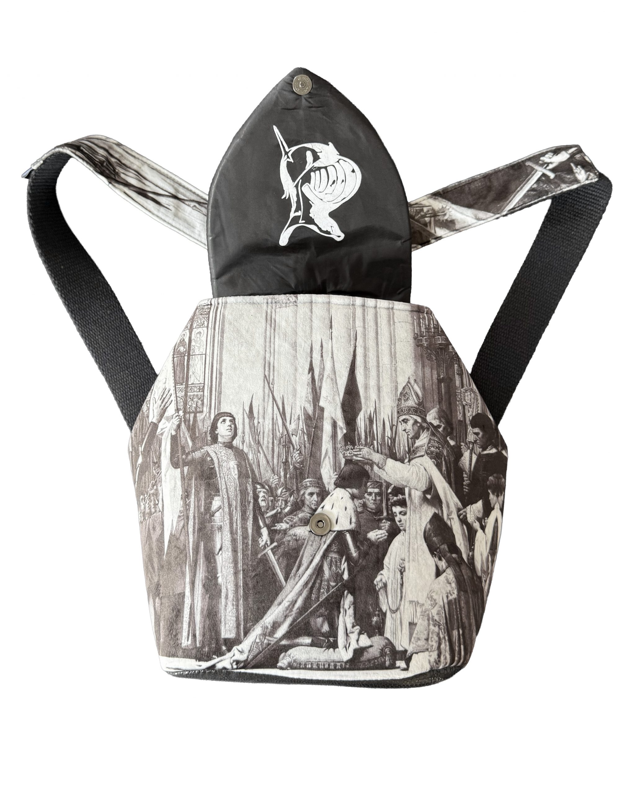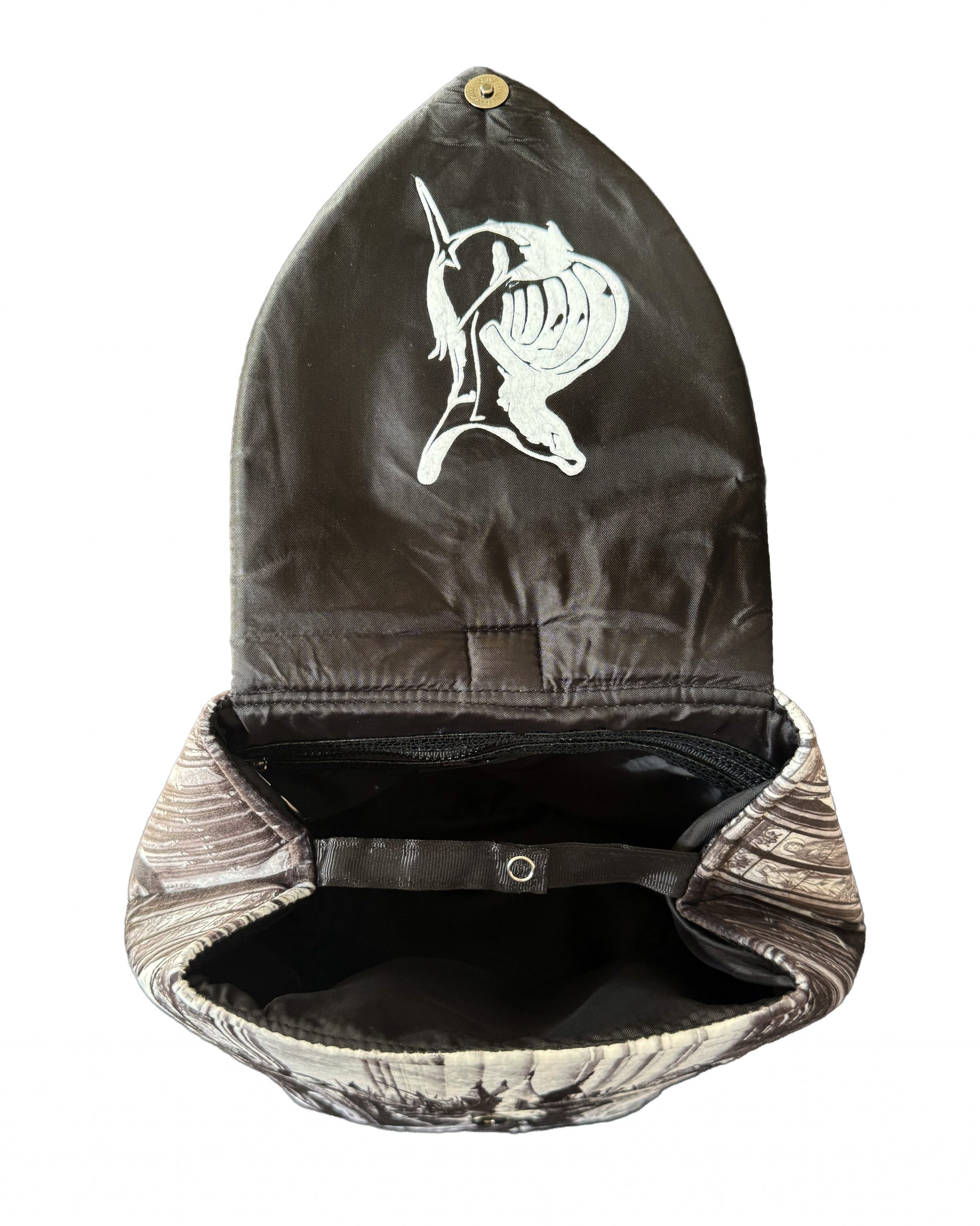 One of a kind printed recycled velvet backpack with cotton webbing straps, brass components and an inner zipper compartment. Comes with matching coin purse.