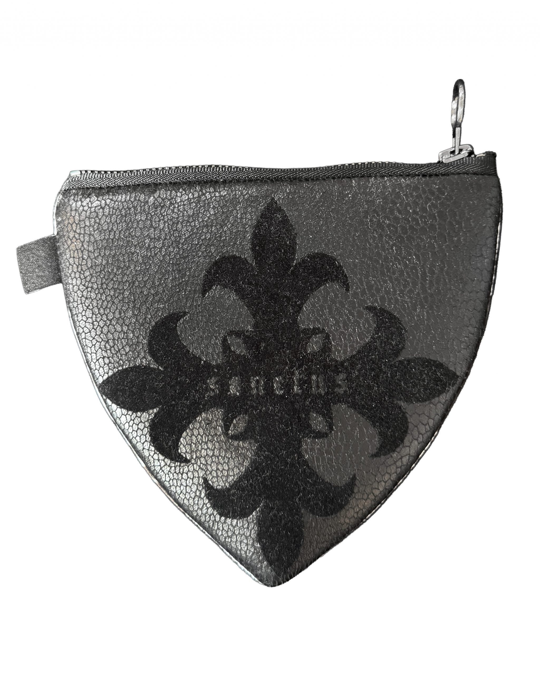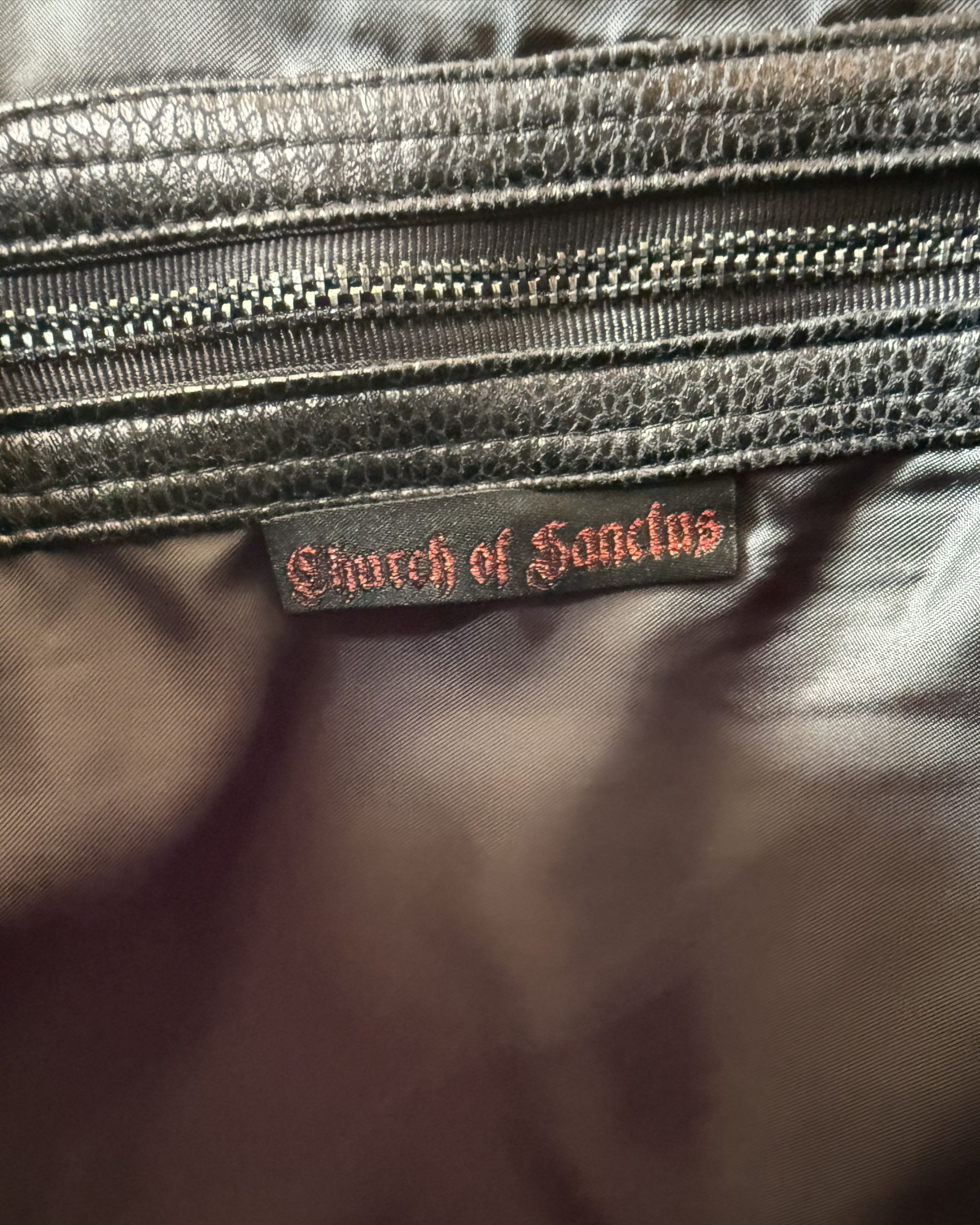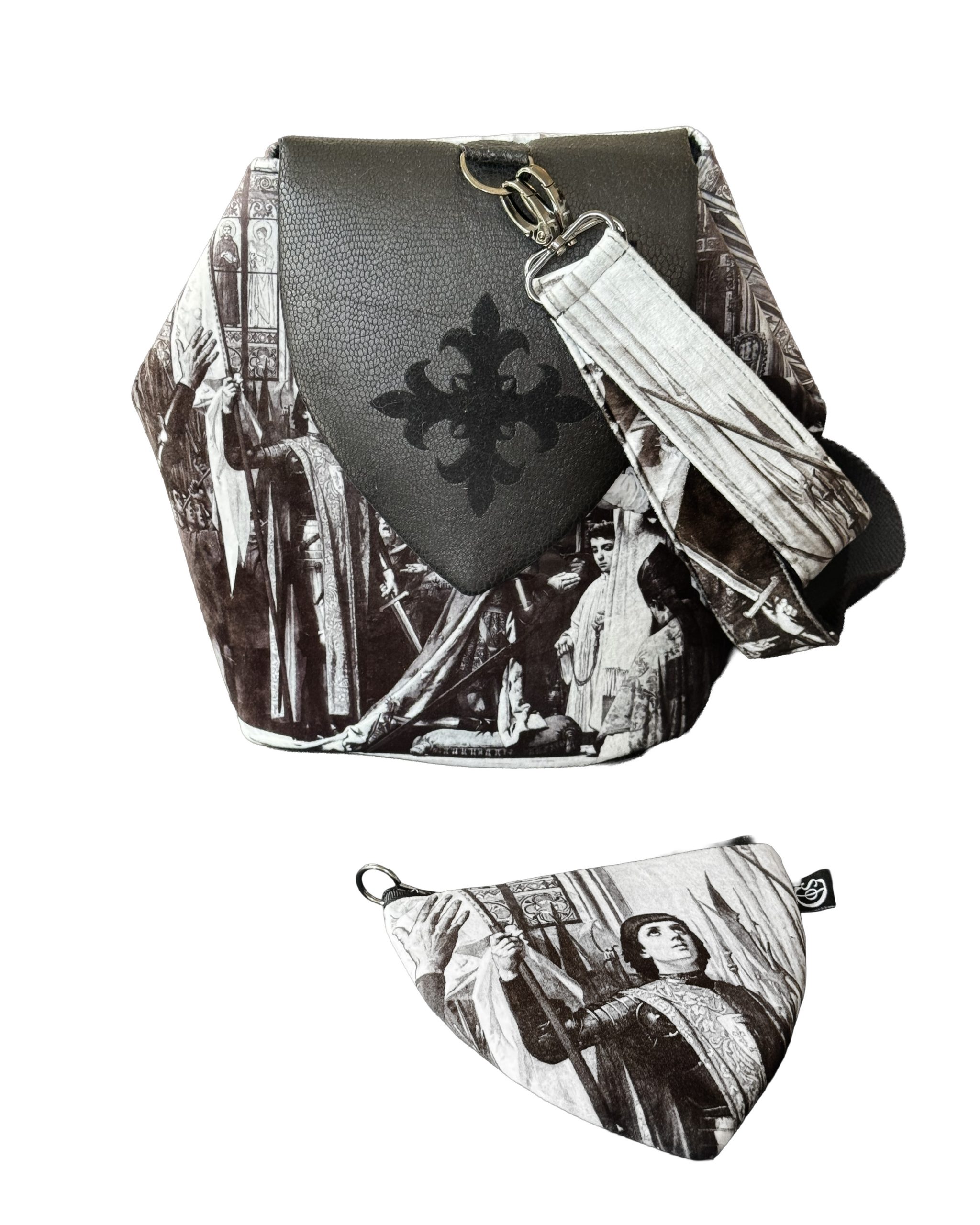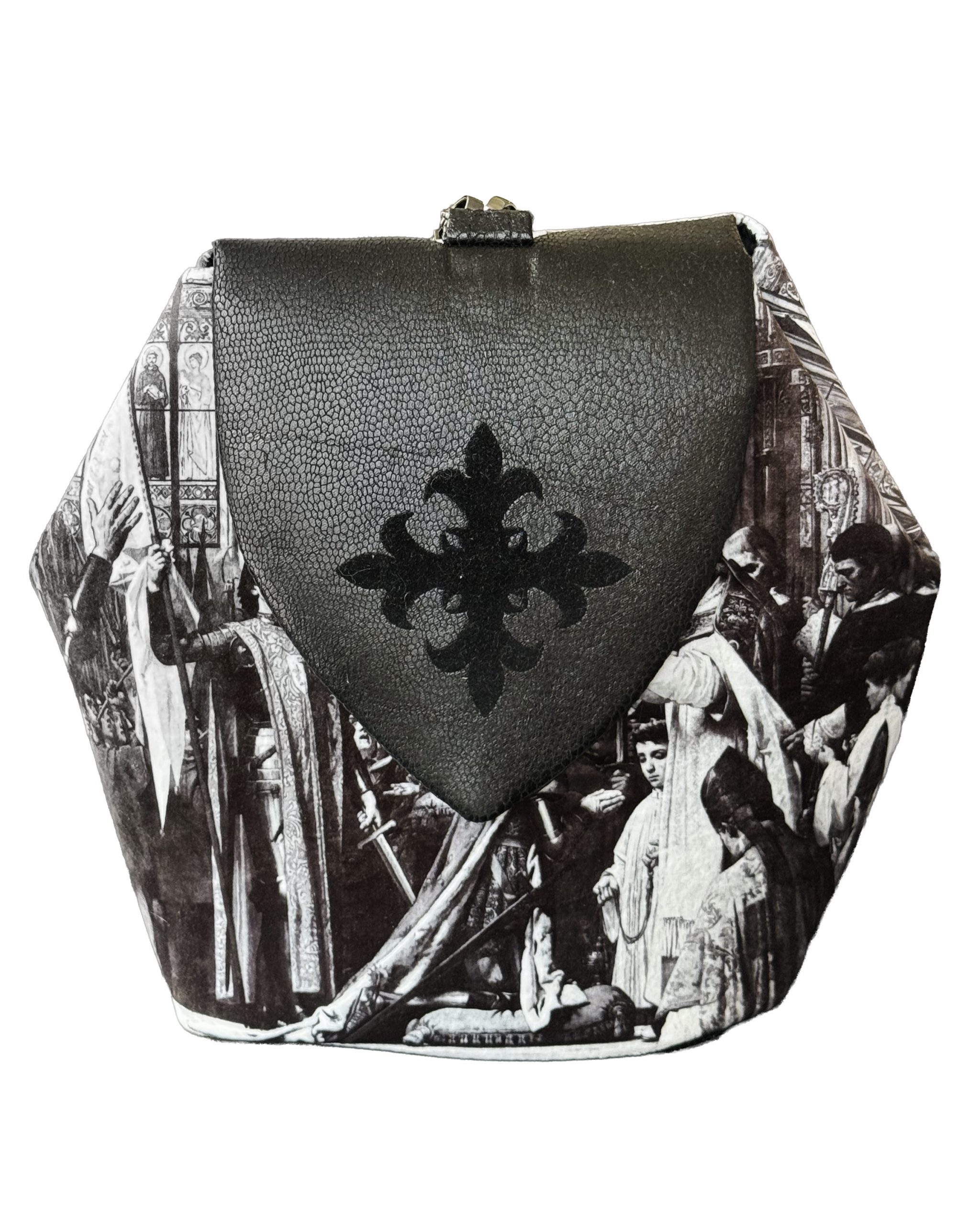 One of a kind printed recycled velvet backpack with cotton webbing straps, brass components and an inner zipper compartment. Comes with matching coin purse.