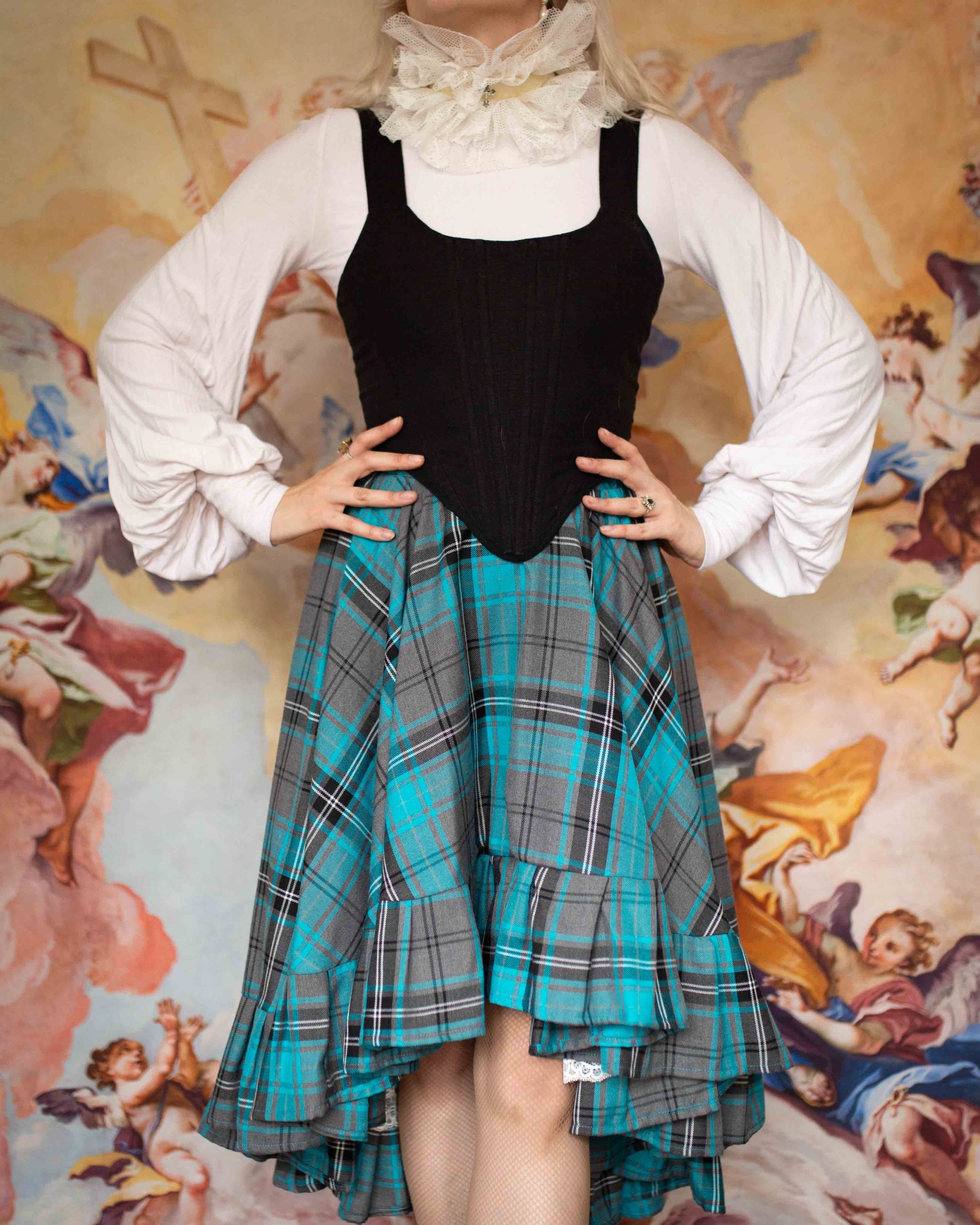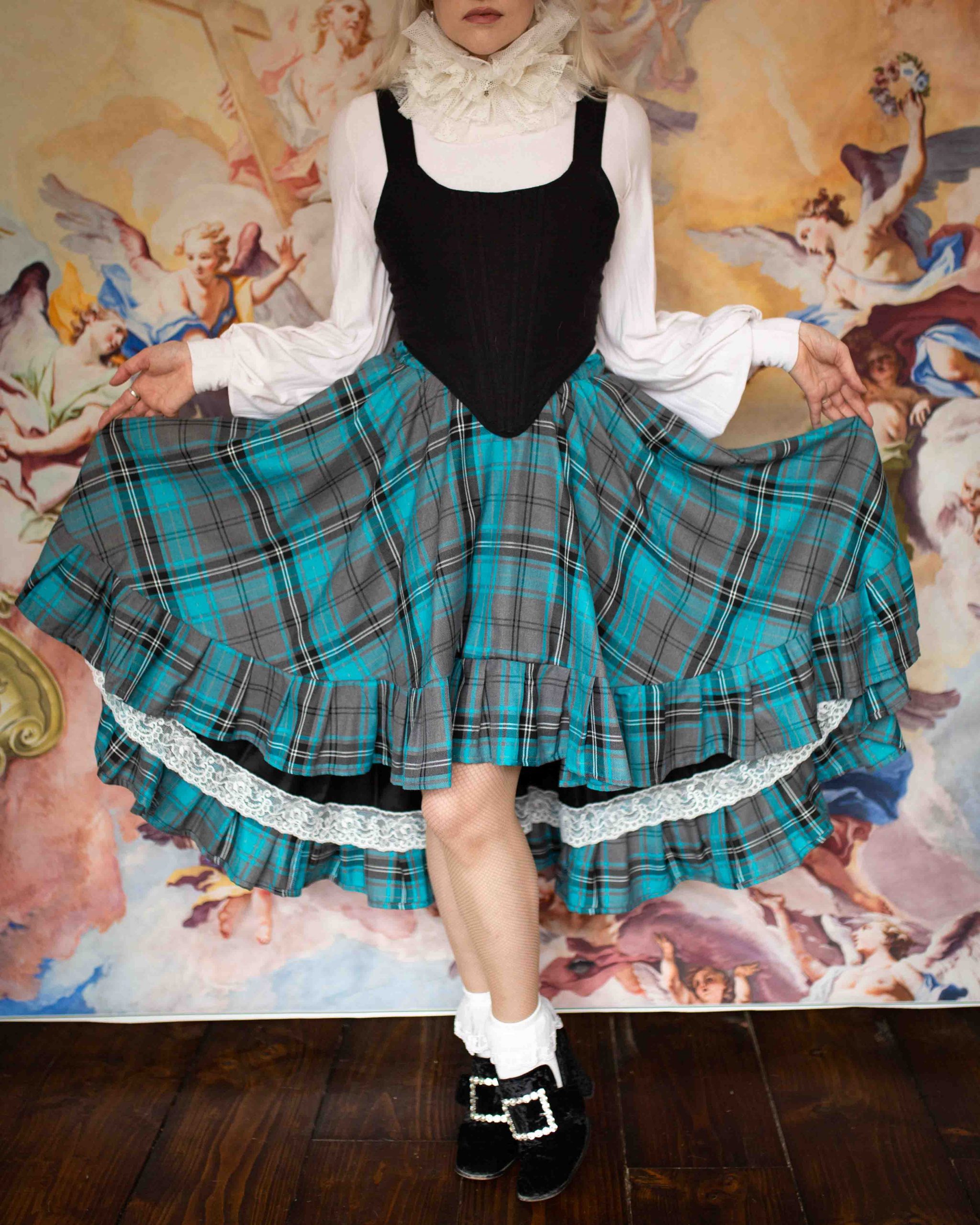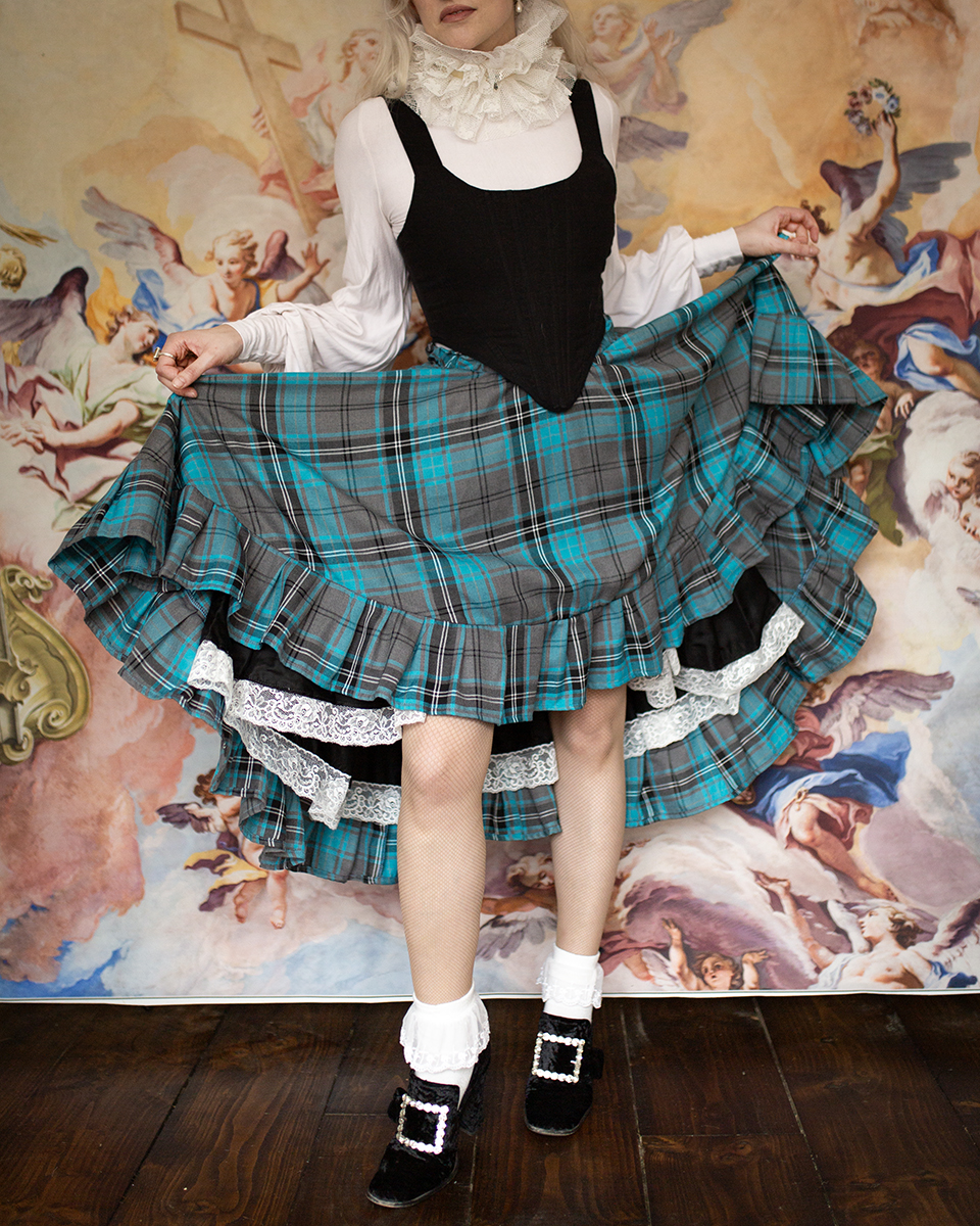 Tartan tiered skirt trimmed with cupro petticoat lining trimmed in vintage lace.