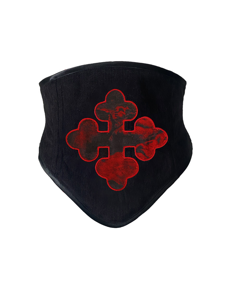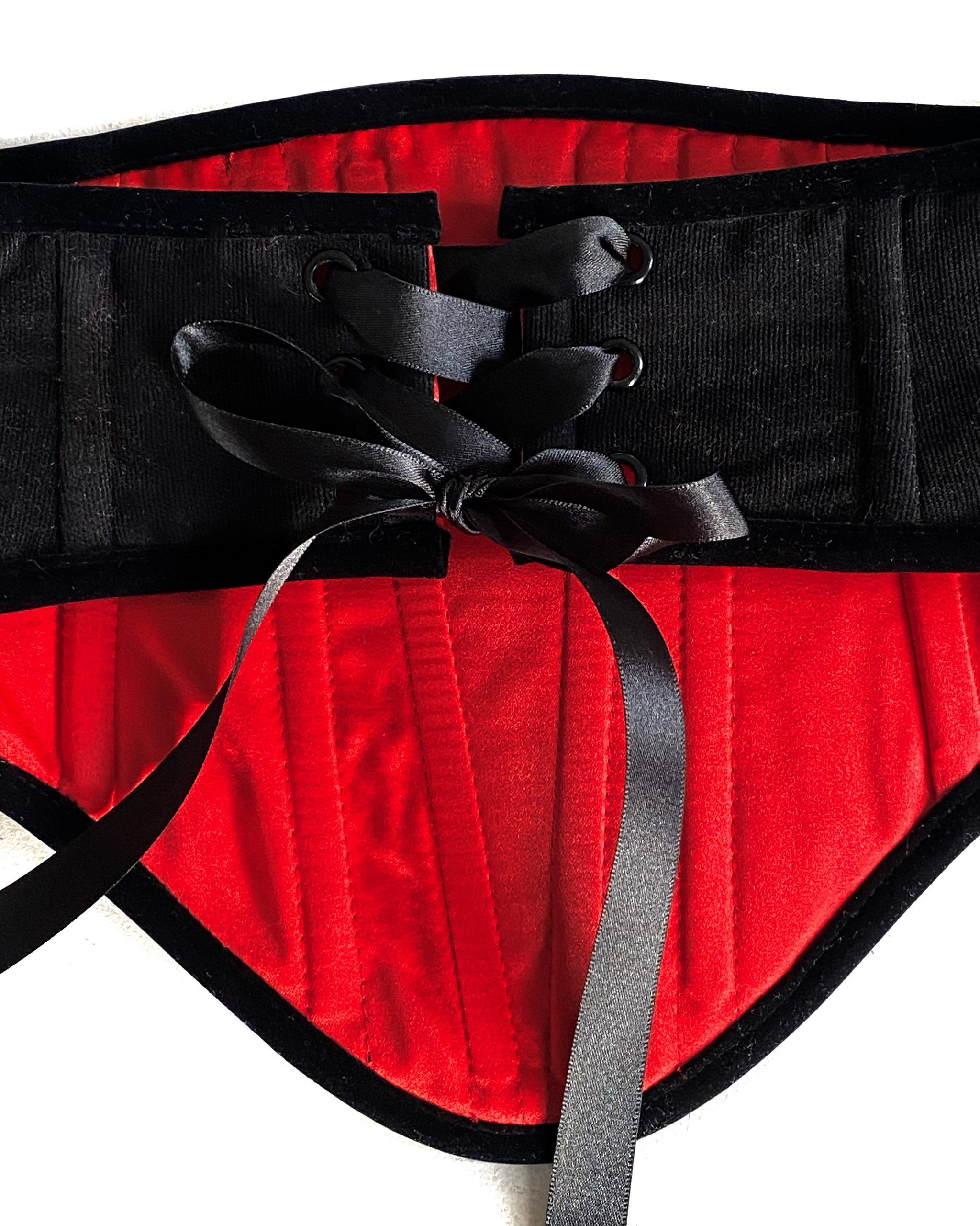 Velvet corset laced in recycled ribbon, featuring handcut and embroidered applique detail in print velvet. Made from repurposed upholstery fabrics and lined in a deadstock satin, with a coutil underlayer and boning throughout for structure.