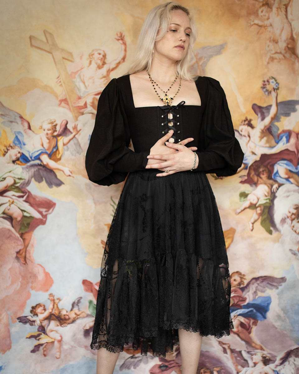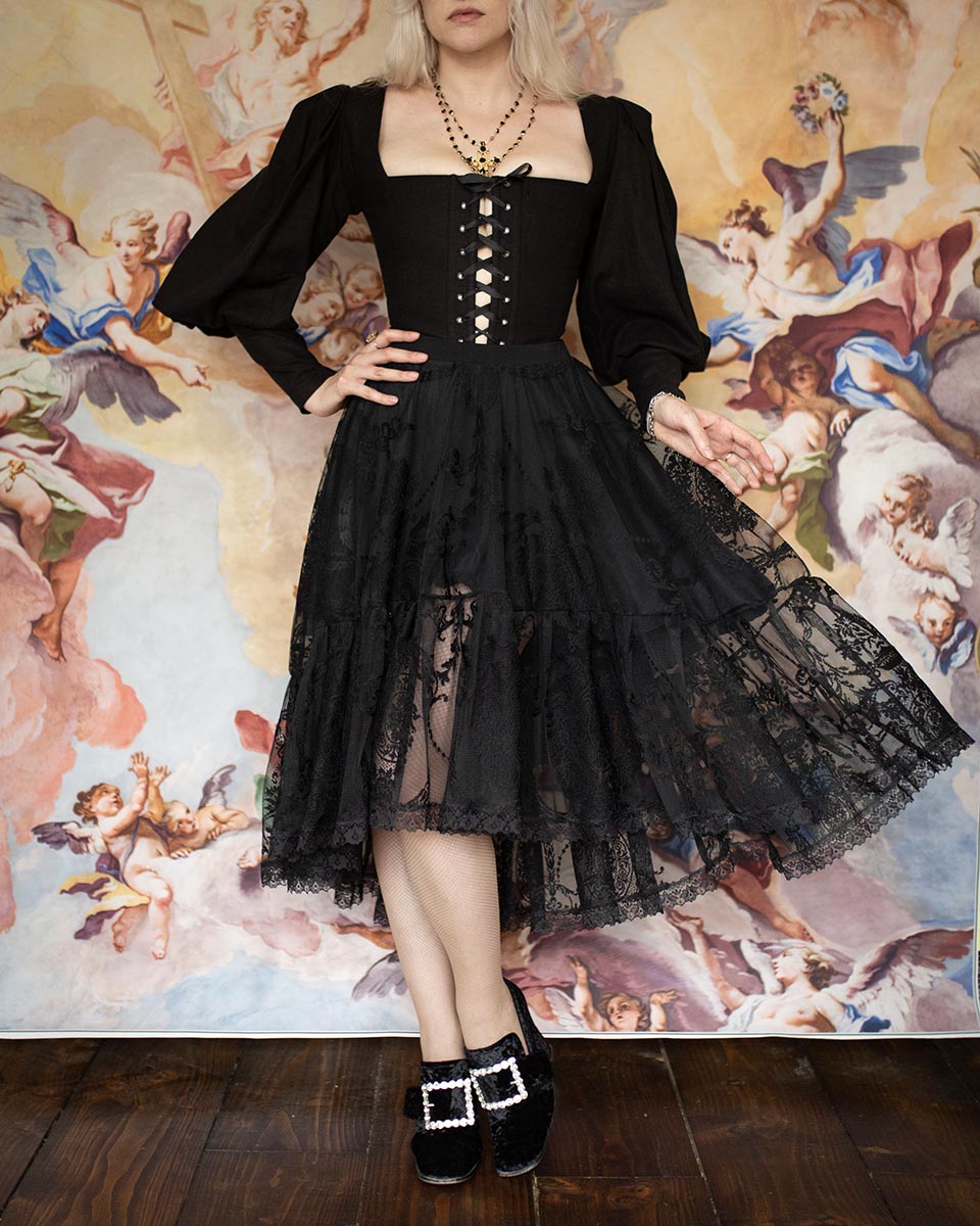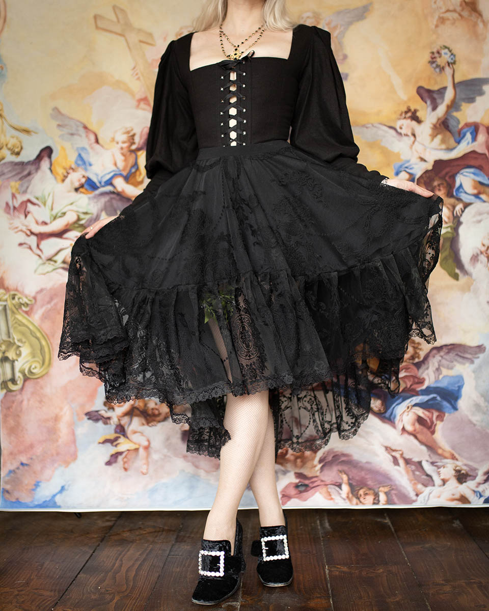 Lace tiered skirt trimmed in vintage lace, upcycled from net curtains and lined in cotton voile.